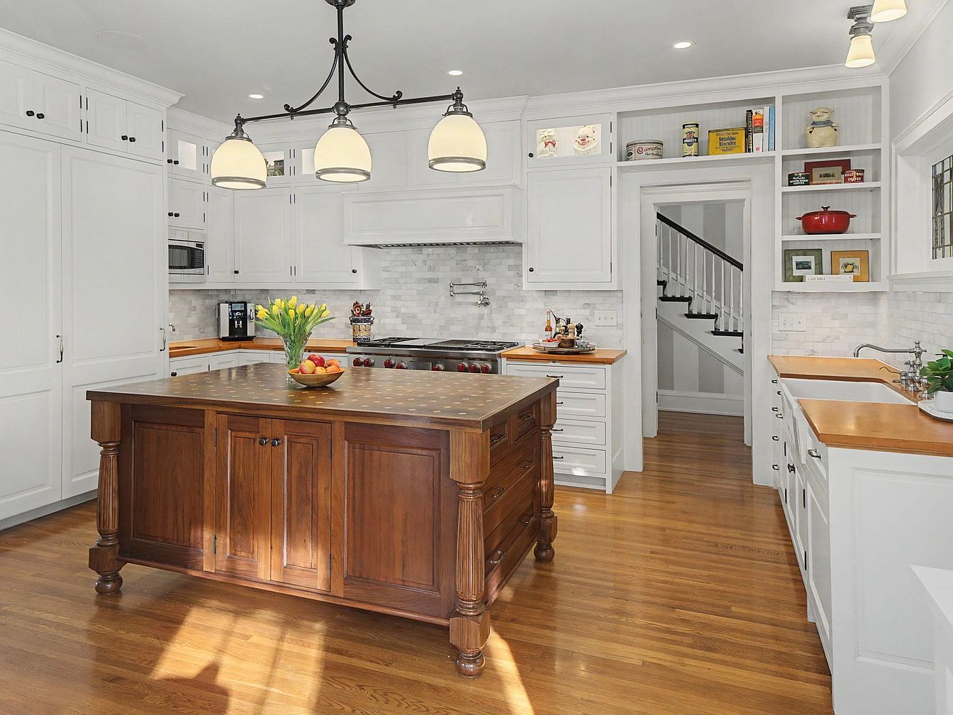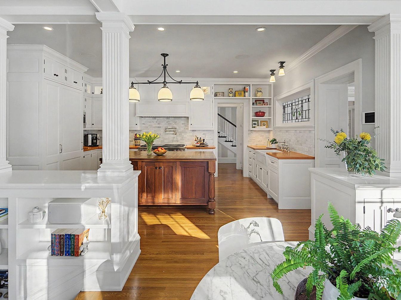 This kitchen features a spacious layout with white cabinetry and sleek stainless steel appliances. A large central island made of rich, dark wood with a polished surface contrasts beautifully with the light tones around it. The countertops are accented with a natural wood finish, adding warmth. A trio of pendant lights hangs above the island, providing soft illumination. Backsplash tiles in a subtle marble pattern lend elegance and texture to the walls. Ample shelving showcases vintage canisters and decorative items. The hardwood flooring enhances the overall inviting atmosphere, creating a sophisticated yet cozy culinary space.