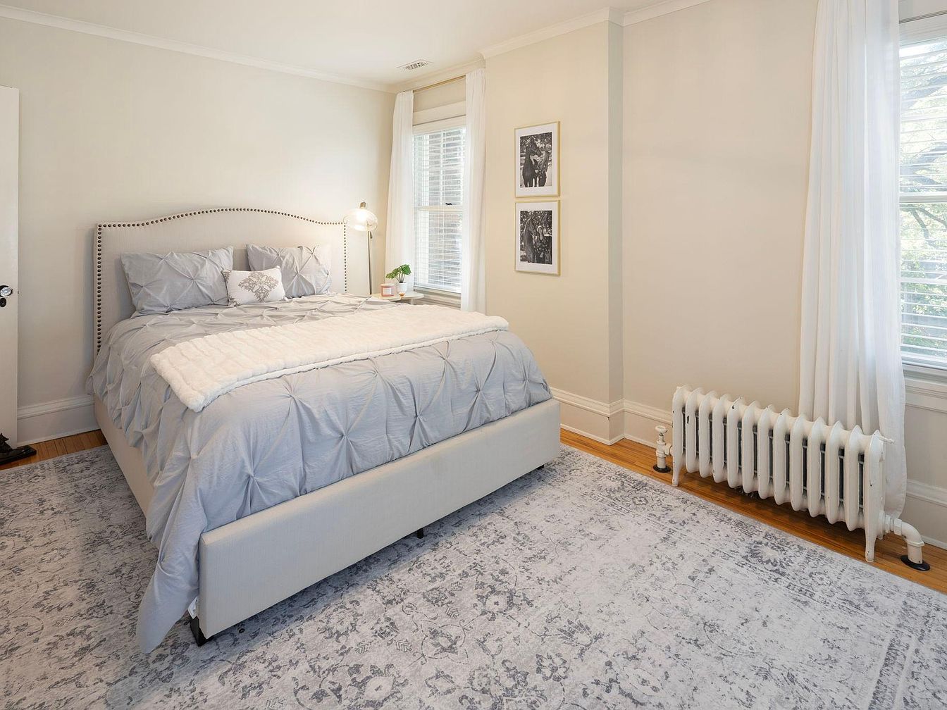 This cozy bedroom features a light gray color scheme, emphasizing serenity and comfort. A plush, upholstered bed with subtle tufting serves as the centerpiece, dressed in modern, decorative pillows. A soft, white throw blanket drapes over the bed, enhancing warmth. Beside the bed, a sleek, minimalist lamp provides ambient lighting. Natural light floods the room through a window adorned with sheer white curtains, illuminating the rich wooden floor. On the wall, framed photos add a personal touch, while an antique-style radiator adds character. The overall aesthetic exudes elegance and tranquility, perfect for a restful retreat.