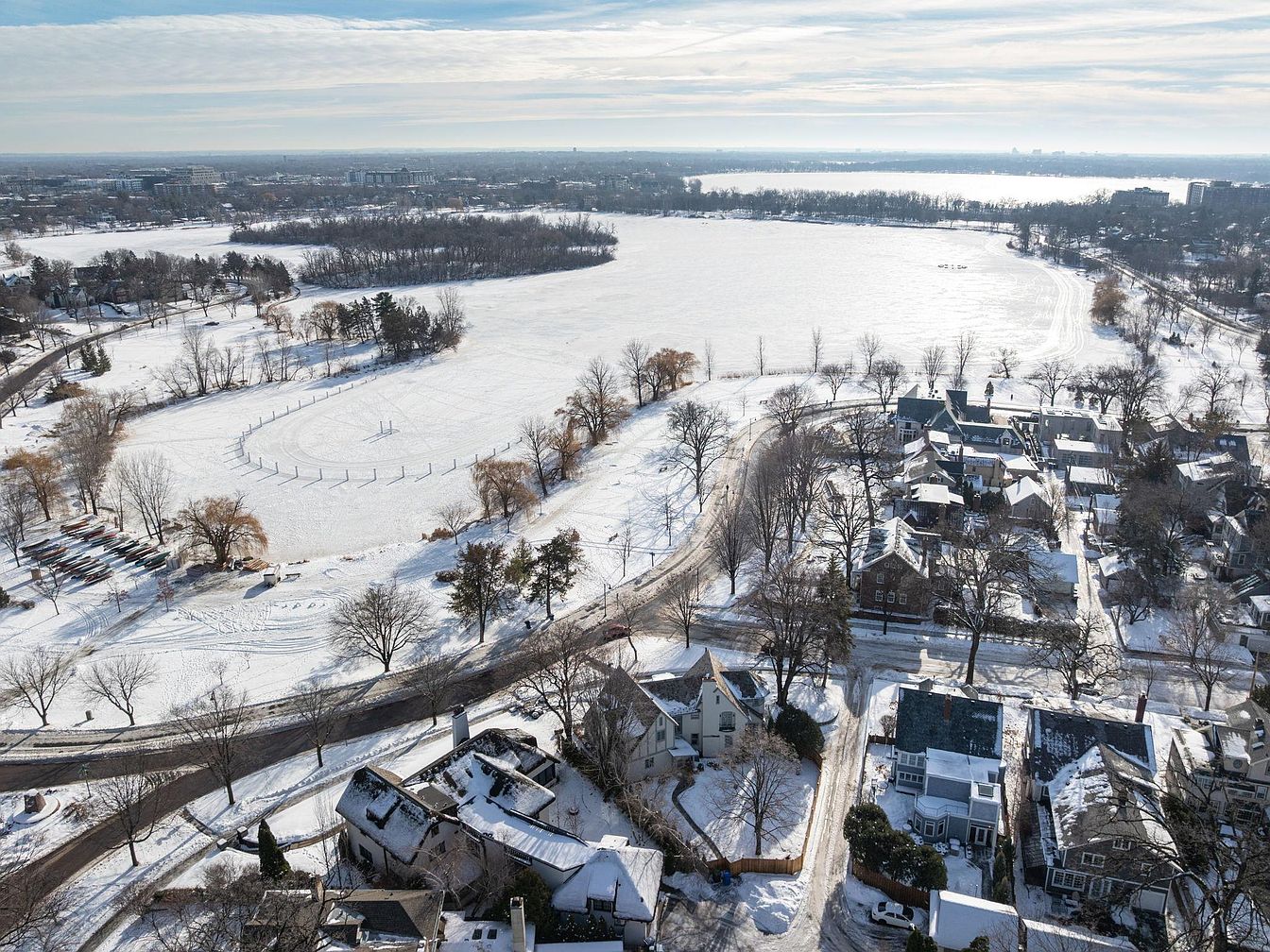 An aerial view of a snowy neighborhood adjacent to a frozen lake reveals a serene winter landscape. The scene is dominated by white snow, blanketing the ground and rooftops of historic homes, showcasing diverse architectural styles with steep roofs and intricate details. Trees, now bare, underscore the tranquil atmosphere, while the lake reflects a soft blue hue from the sky. A winding road cuts through the homes, leading to a recreational area marked by clear paths in the snow. The overall aesthetic embodies a picturesque winter day, capturing the beauty of the season and the charm of the neighborhood.
