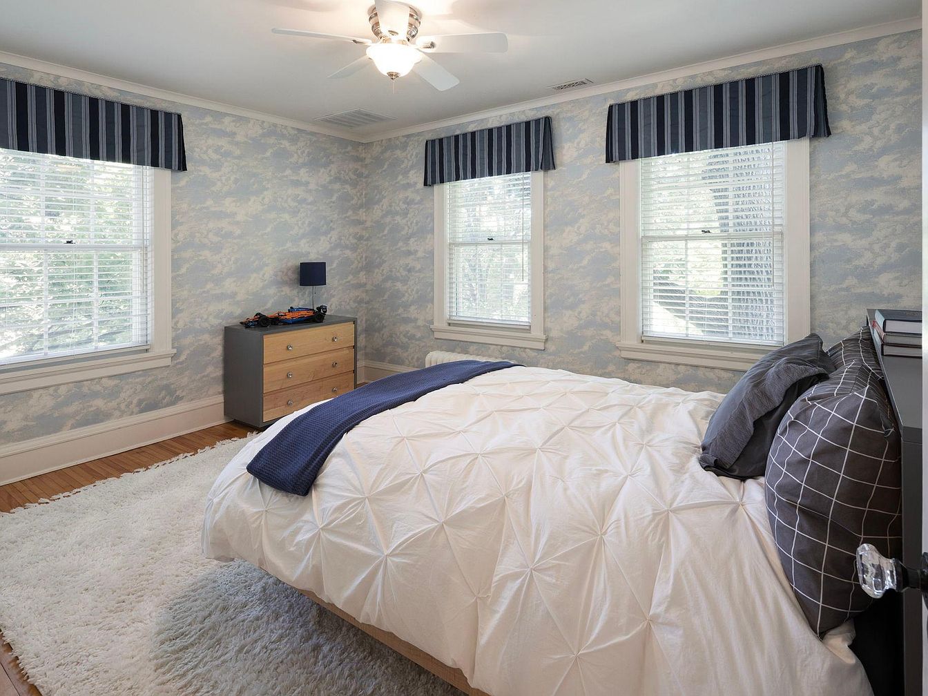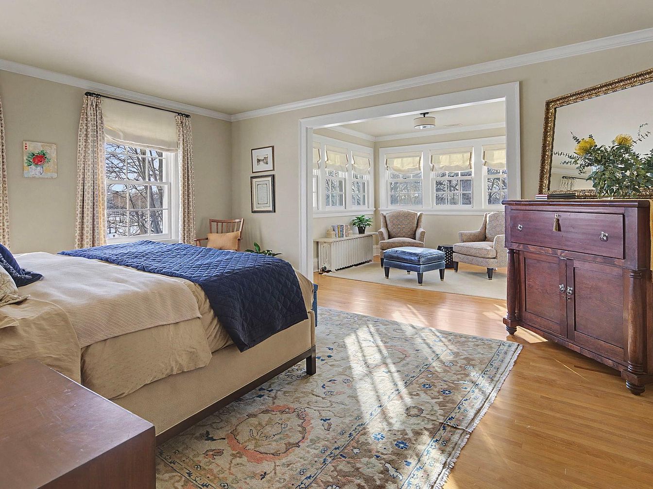 This cozy bedroom features a light beige color palette, complemented by soft textures and natural light filtering through large windows adorned with patterned curtains. A plush bed, layered with a navy blue quilt, invites comfort. Adjacent to the bed, a wooden bedside table adds warmth, while an intricately designed area rug introduces elegance beneath. The room opens into a sunlit seating area, with two upholstered chairs and an ottoman, framed by large windows. Art pieces and framed documents accentuate the walls, enriching the space with personality and history. A vintage wooden dresser with detailed knobs completes the aesthetic.