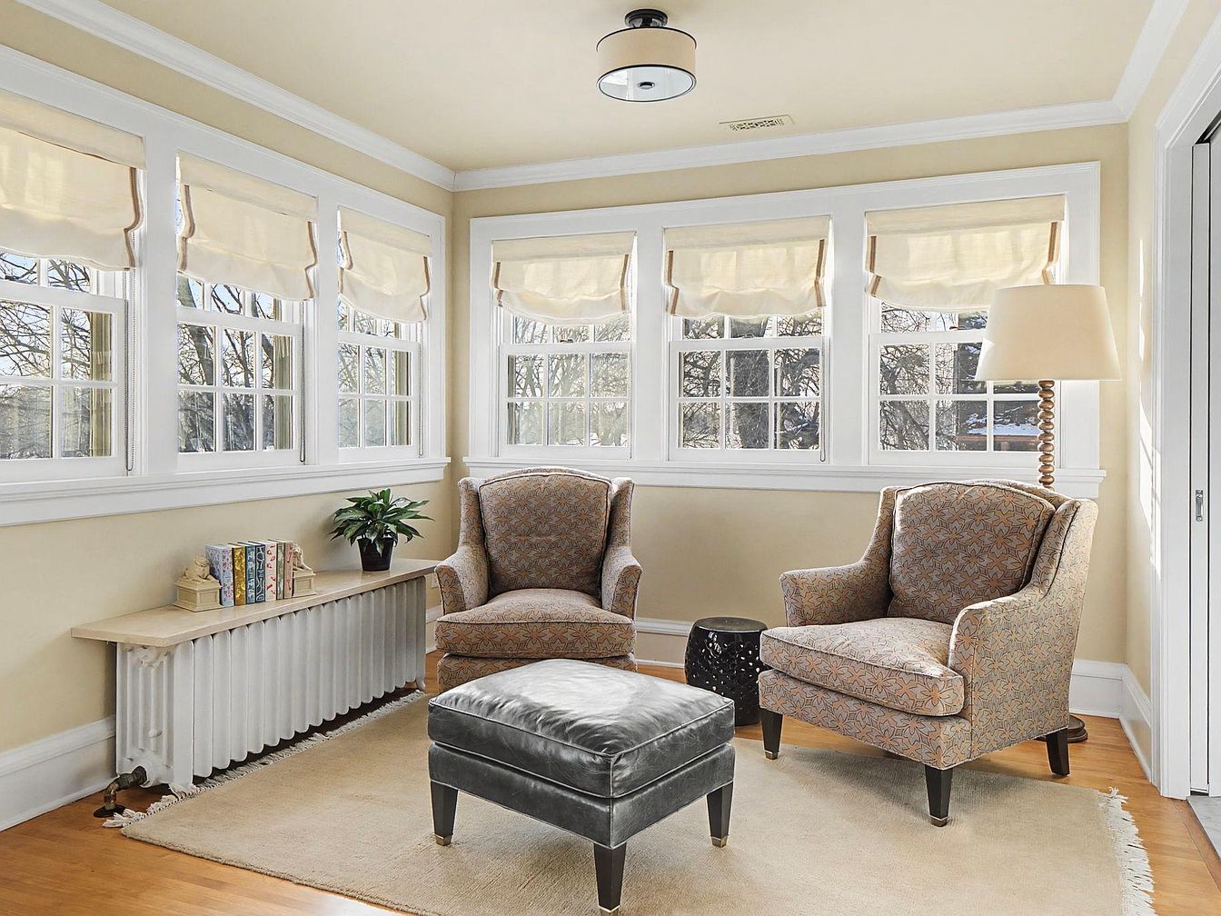 This sunroom features soft, warm beige walls that create an inviting atmosphere. Natural light pours in through multiple windows adorned with light-colored Roman shades, highlighting the elegant architecture. Two upholstered armchairs with intricate floral patterns provide comfortable seating, paired with a sleek gray ottoman at their center. A minimalist wooden table alongside holds a few decorative books and a small potted plant. The room’s wooden flooring complements the subtly textured area rug, enhancing the cozy feel. A stylish floor lamp stands beside one chair, adding both functionality and charm, making this space perfect for relaxation.