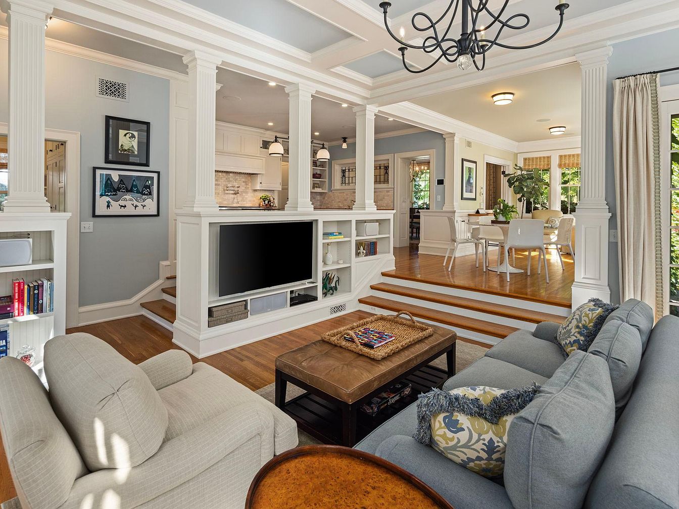 A welcoming living room featuring a blend of modern and classic design elements. The light gray walls and elegant crown molding create an airy atmosphere. A plush gray sectional sofa, adorned with decorative pillows, faces a stylish media console beneath a flat-screen TV. In the background, an open dining area showcases a circular table surrounded by contemporary chairs, complemented by natural light pouring through large windows. Rich wooden floors add warmth, while white columns define the space, providing architectural interest. A tasteful chandelier hangs above, enhancing the sophisticated ambiance of this inviting family area.
