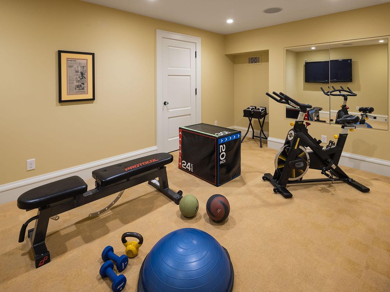 This home gym features a cozy, warm beige color scheme that enhances the inviting atmosphere. The space is thoughtfully designed with a balanced layout, accommodating various fitness equipment. A black weight bench with a brand logo stands prominently, accompanied by colorful kettlebells and dumbbells scattered on a plush carpet. In one corner, a sleek stationary bike and a sturdy plyometric box showcase functionality. A wall-mounted TV and a large mirror reflect the room’s dimensions, contributing to an open feel. Framed artwork adorns the wall, adding personality while maintaining a minimalist aesthetic.