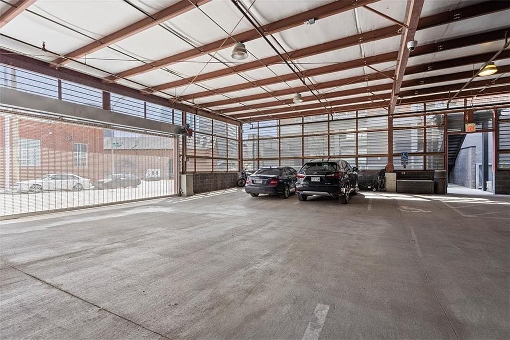 An expansive garage area featuring a modern design, characterized by a high ceiling supported by exposed metal beams. The concrete floor is well-maintained and provides a stark contrast to the sleek vehicles parked underneath. Large, gridded windows line the walls, allowing ample natural light to fill the space, enhancing visibility and creating an airy atmosphere. The open layout permits easy maneuverability and accessibility, while a rolling door offers entrance to the outside. Industrial-style light fixtures hang from the ceiling, contributing to the contemporary feel of this functional yet stylish parking area.