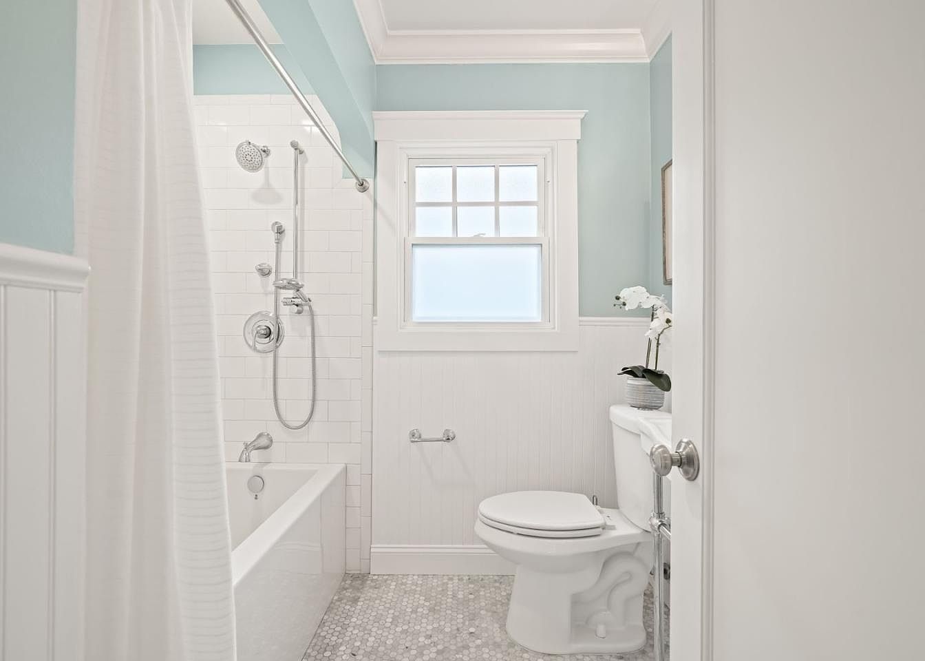 This bathroom features a clean, modern design with a soothing color scheme of soft pastel blue walls and classic white wainscoting. A combination tub and shower, enclosed in white ceramic tiles, creates a fresh, light atmosphere. The polished chrome fixtures add a contemporary touch, while the hexagonal mosaic tile flooring offers texture and visual interest. A large window fills the space with natural light, complementing a potted orchid on the countertop, introducing a hint of nature. Overall, the design emphasizes functionality and tranquility, making it an inviting retreat.