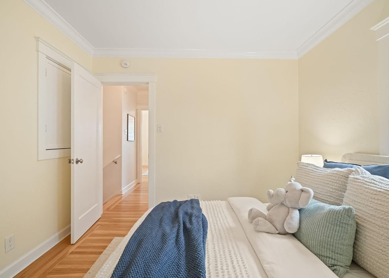 This cozy bedroom features a soothing palette with soft yellow walls and polished hardwood flooring, creating a warm atmosphere. A plush bed with white and textured throw pillows invites relaxation, with a navy blue blanket draped casually across it. A light gray stuffed elephant sits atop the bed as a playful accent. The open door leads to a well-lit hallway, visible through a tidy, white corridor that enhances the space’s openness. Architectural details include crown molding along the ceiling, adding a touch of elegance. A soft, diffused lamp beside the bed provides gentle illumination, perfect for nighttime comforts.