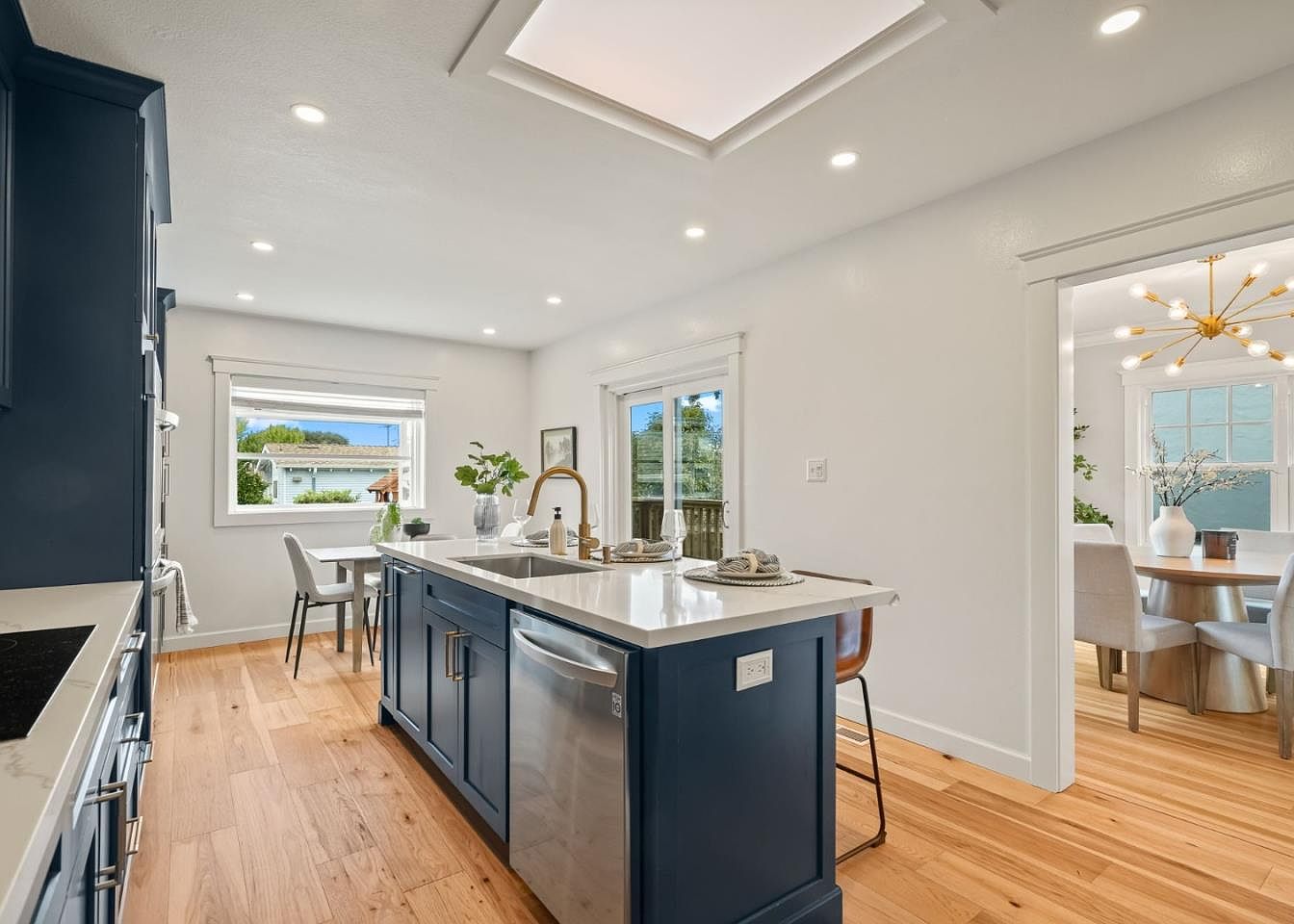 Spacious kitchen featuring a central island with a sleek white countertop. The cabinetry showcases a rich navy blue color, contrasting beautifully with the crisp white walls. Natural wood flooring adds warmth to the space. The island accommodates seating on one side with modern, curved stools. Ample lighting from recessed fixtures and a stylish overhead light illuminates the area, enhancing its airy feel. A large window allows plenty of natural light and offers a view of the outside. Adjacent to the kitchen, an inviting dining area is partially visible, creating a seamless and functional layout for gatherings.