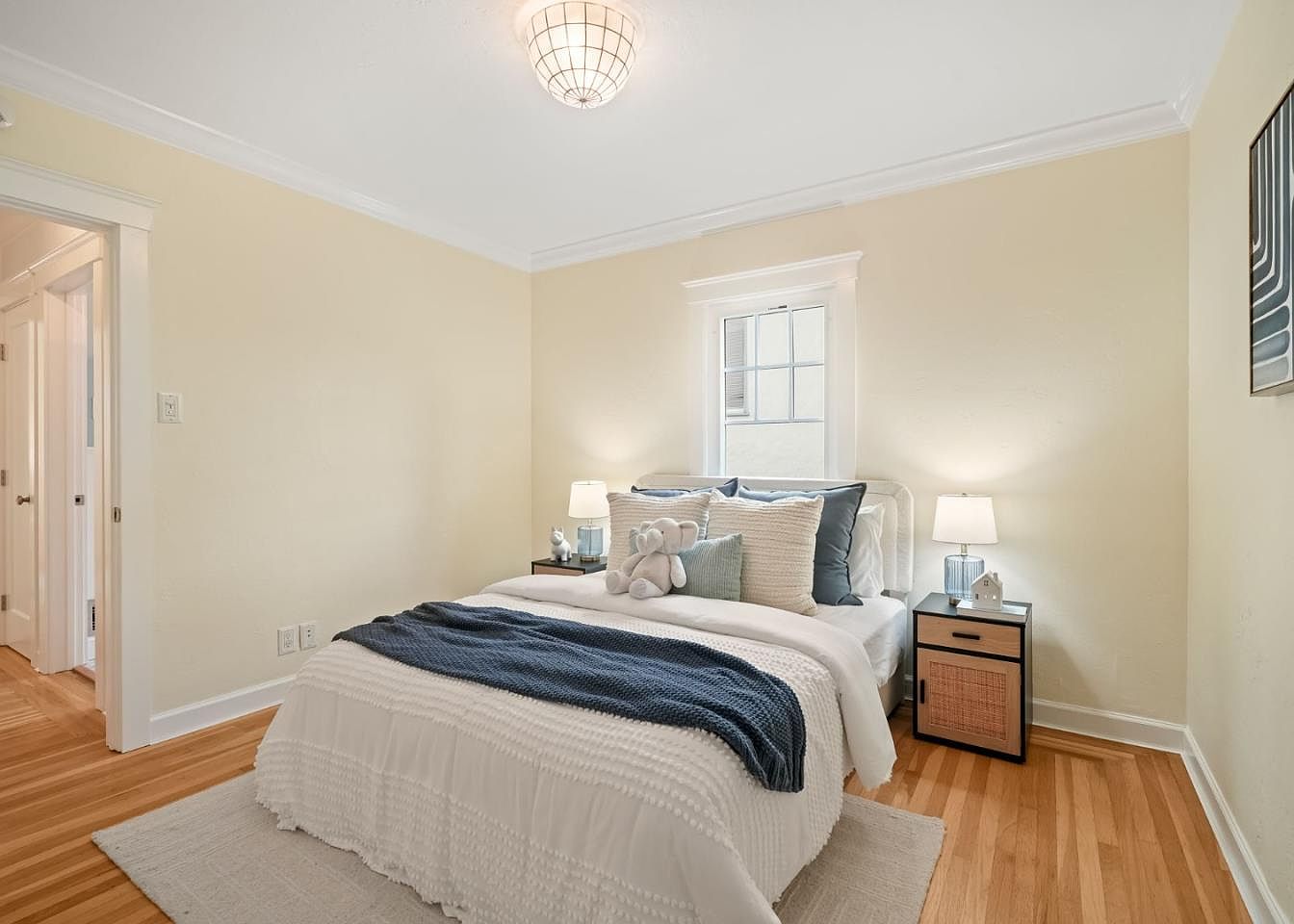 A cozy bedroom featuring soft, warm yellow walls and natural light streaming through a window. The focus is a neatly made bed adorned with white and blue textured pillows, providing a calming color palette. A knitted blue throw blanket drapes over the bed’s edge. Beside the bed, a modern nightstand showcases a lamp with a soft glow and decorative items, enhancing the room’s charm. The hardwood floors exhibit rich tones, contributing to a welcoming atmosphere. Architectural details include crown molding along the ceiling, which adds elegance, and the overall design evokes a sense of tranquility and comfort.