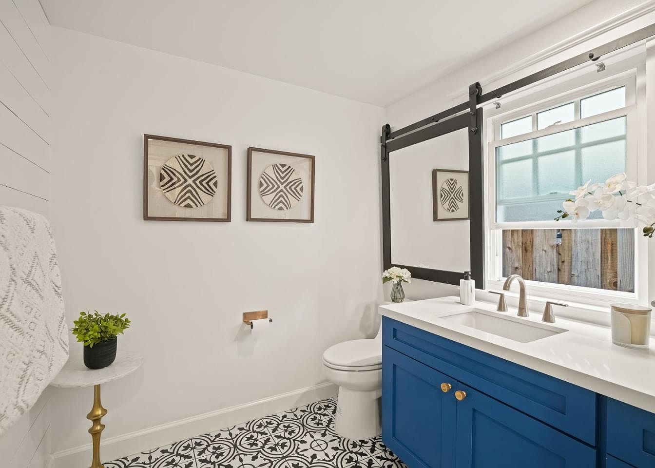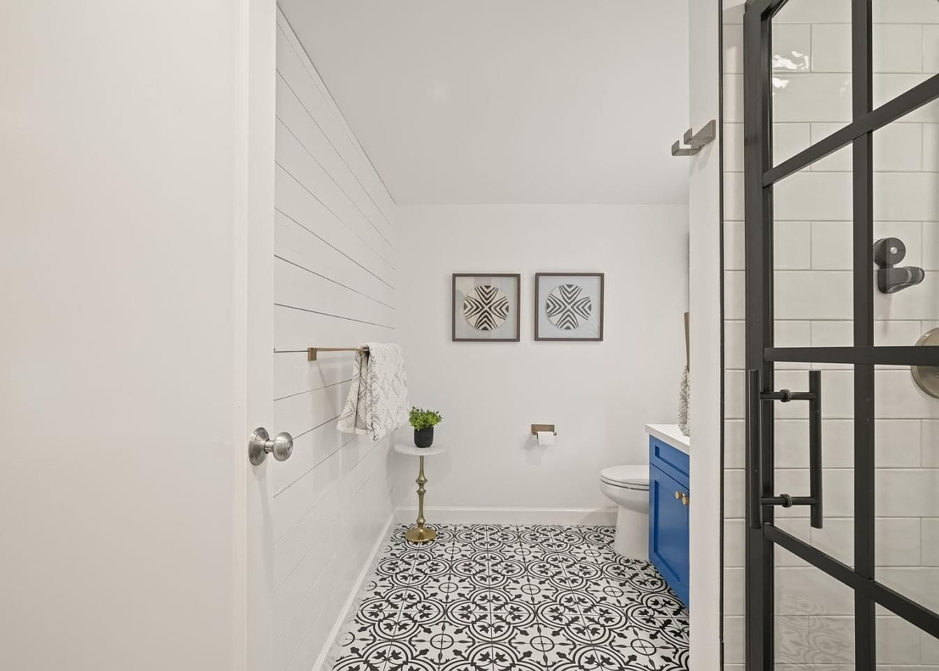 This bathroom features a contemporary design with a striking layout. A white shiplap wall adds texture, while a bold blue vanity introduces a vibrant pop of color. The floor is adorned with intricate black and white patterned tiles that create visual interest. Above the vanity, two framed artworks enhance the aesthetic appeal, echoing the bathroom’s color scheme. A black-framed glass shower enclosure demonstrates modern craftsmanship and provides a sleek contrast to the white tiles. Soft natural light illuminates the space, highlighting the clean lines and minimalist decor, creating a serene and inviting atmosphere.