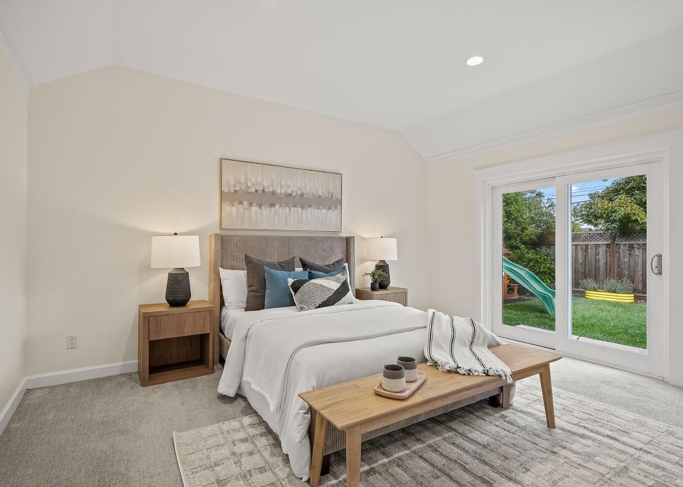 A serene bedroom featuring a high vaulted ceiling and light beige walls that create an airy atmosphere. The bed is elegantly dressed with white linens, layered with a soft gray blanket and assorted pillows in muted blues and earth tones. Flanking the bed are modern wooden nightstands topped with stylish black table lamps. A wooden coffee table sits at the foot of the bed, decorated with a couple of ceramic mugs and a neutral-toned tray. Bright natural light floods the room through large glass doors leading to a verdant backyard, adding a refreshing touch to the intimate space.