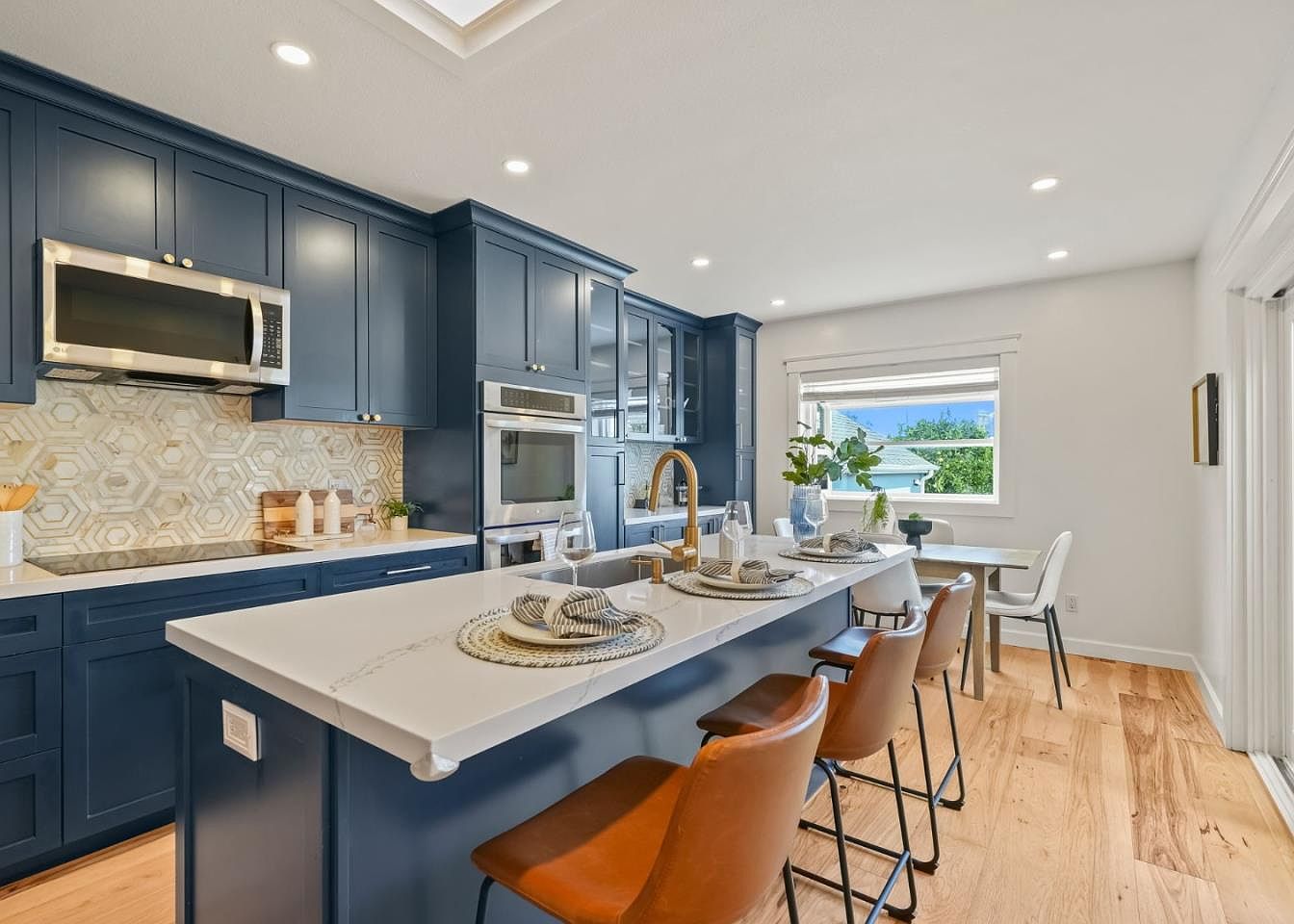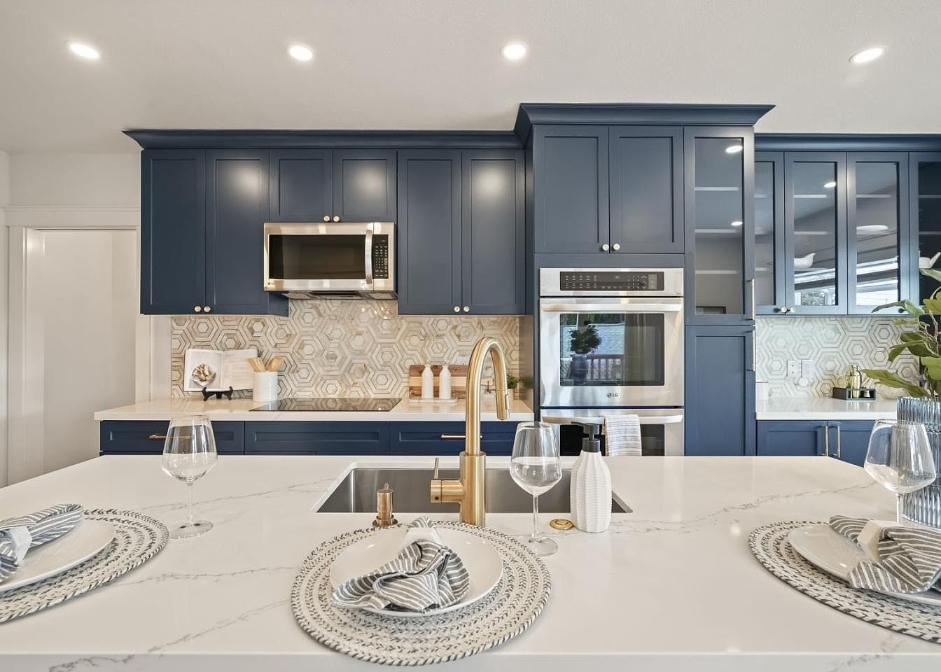 This modern kitchen features navy blue cabinetry that contrasts beautifully with a contemporary white quartz countertop. The backsplash consists of geometric hexagonal tiles in a soft beige, adding texture and visual interest. A sleek gold faucet stands out against the marble pattern on the countertop, highlighting the integration of luxury and functionality. The kitchen island is set with elegant dinnerware, including white plates with striped napkins stacked on woven placemats. recessed lighting illuminates the space, enhancing the brightness of the white walls. Built-in appliances, including a microwave and double oven, echo the stylish and efficient design.