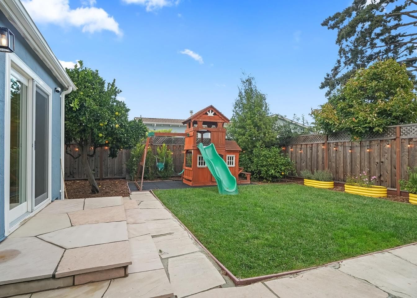 A vibrant backyard showcases a well-maintained green lawn, perfect for outdoor activities. A wooden playhouse with a slide is positioned prominently, inviting children to enjoy their playtime. The warm hues of the playhouse contrast beautifully against the bright green slide. Surrounding the play area, a variety of trees and shrubs add lushness, while a lemon tree with yellow fruit stands out on the left. The fence enclosing the space is adorned with fairy lights, enhancing the atmosphere. A stone pathway leads from the house to the lawn, complementing the space with a natural earthy appeal.