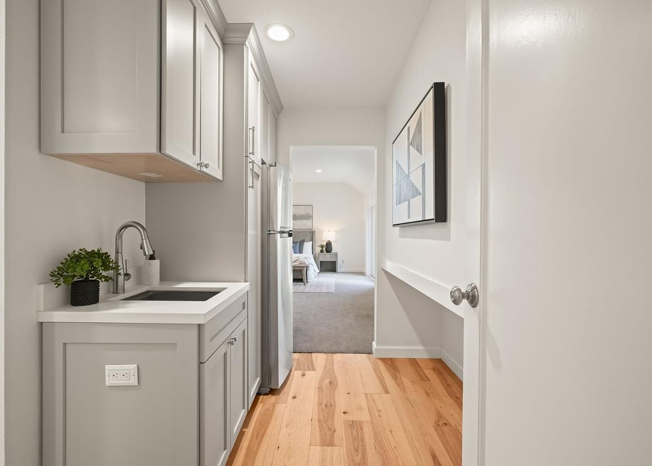 This laundry room features a compact layout with light gray cabinetry that offers a modern touch. A sleek, white countertop provides workspace next to a stainless steel sink, ideal for utility tasks. In the corner, a full-size refrigerator complements the cabinetry, enhancing functionality. Subtle natural light filters in, casting a warm glow on the polished wooden floor, which showcases golden tones. A decorative potted plant adds a hint of greenery, creating a fresh atmosphere. The open entryway leads to an inviting living space beyond, where soft carpets and neutral tones continue the design theme.