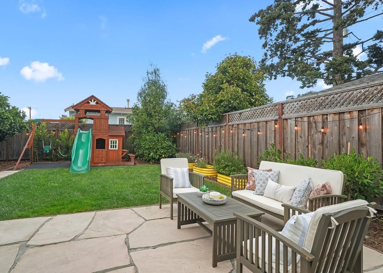 A spacious backyard showcases a green lawn surrounded by vibrant foliage and wooden fencing. In the foreground, a comfortable seating area features light, cushioned sofas adorned with decorative pillows. A stone patio provides a natural base, with irregularly shaped flagstones enhancing the organic feel. Toward the rear, a charming wooden playset with a green slide attracts children, complementing the relaxed atmosphere. Soft lighting strung along the fence adds a warm ambiance. Bright yellow planters filled with plants provide pops of color and balance with the greenery, creating an inviting retreat perfect for relaxation or play.