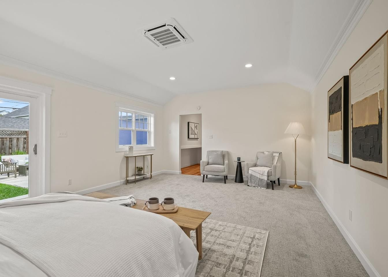 A cozy bedroom space features a light, neutral color palette of soft whites and beige, enhancing a serene atmosphere. The room is spacious, with plush light gray carpeting adding warmth underfoot. A king-sized bed with a textured white duvet sits at the center, complemented by a wooden nightstand holding decorative cups. To one side, two contemporary armchairs offer a comfortable sitting area, accompanied by a sleek side table. Framed abstract artwork on the walls introduces subtle color accents, while a stylish floor lamp provides soft lighting. Natural light streams in through double doors leading to a quaint outdoor area.