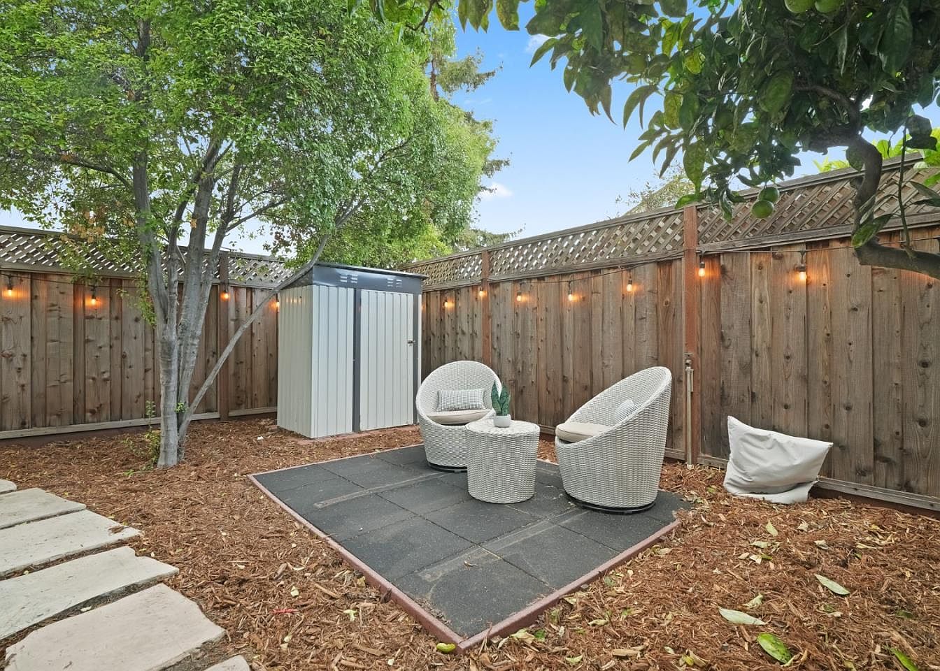 This cozy garden area features a minimalist design with a dark rubber-paved seating space surrounded by a mulch bed. Two rounded, white woven chairs are paired with a small, circular table, offering a serene spot for relaxation. An intelligent use of green elements is seen with a small potted plant on the table and a nearby tree providing shade. The wooden fencing adds warmth, highlighted by string lights that create an inviting ambiance as dusk falls. A storage shed stands discreetly at the back, ensuring functionality while maintaining an uncluttered aesthetic in this outdoor retreat.