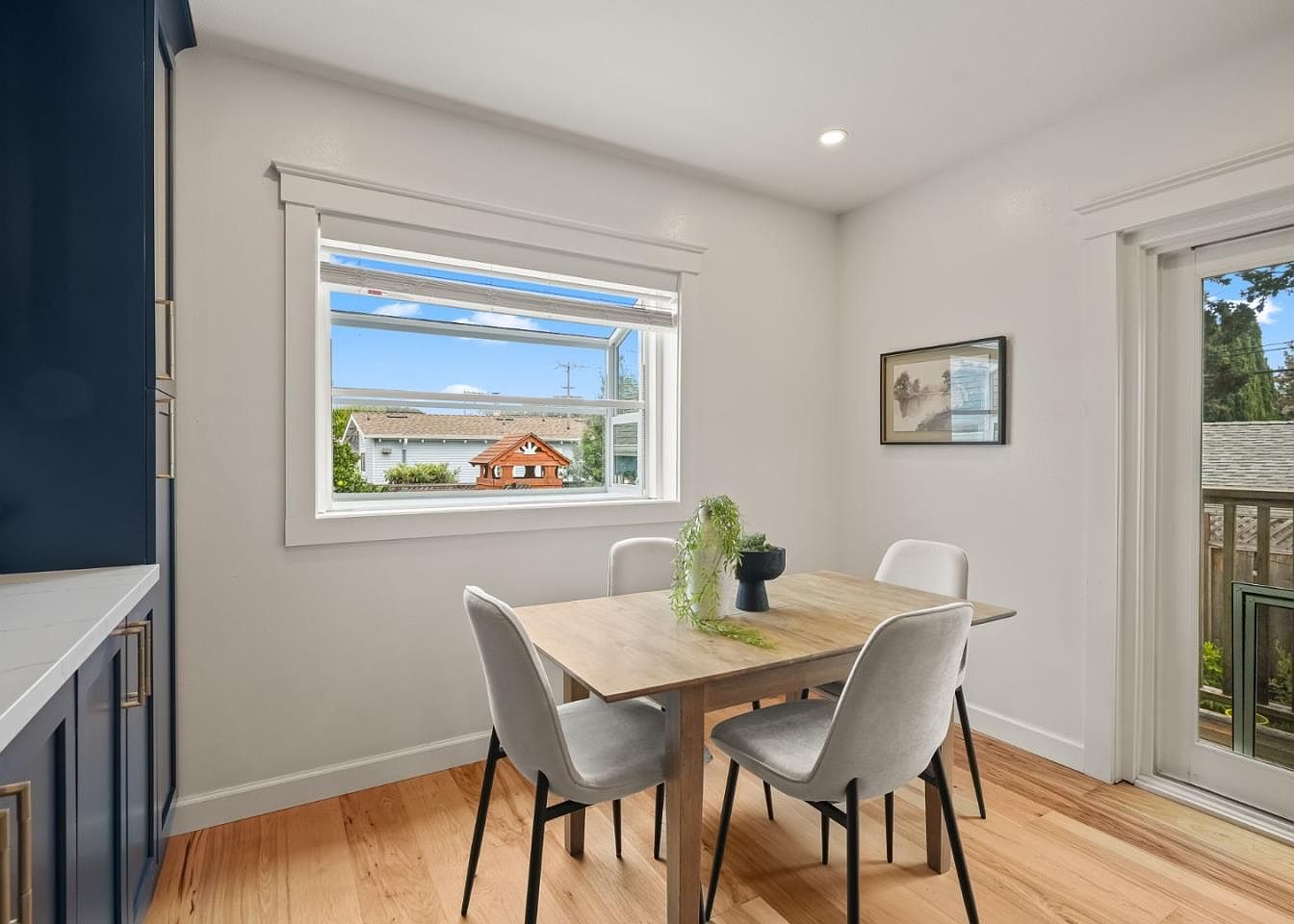 A cozy dining nook showcases a light wood table surrounded by four upholstered chairs with soft, gray fabric. The walls are painted white, enhancing the airiness of the space. A large window invites natural light, offering a view of a quaint outdoor scene. Against one wall, deep blue cabinetry adds a bold contrast while providing practical storage. A small potted plant sits at the center of the table, adding a touch of greenery. The warm wood flooring complements the overall design, creating a welcoming and stylish atmosphere perfect for casual meals or gatherings.