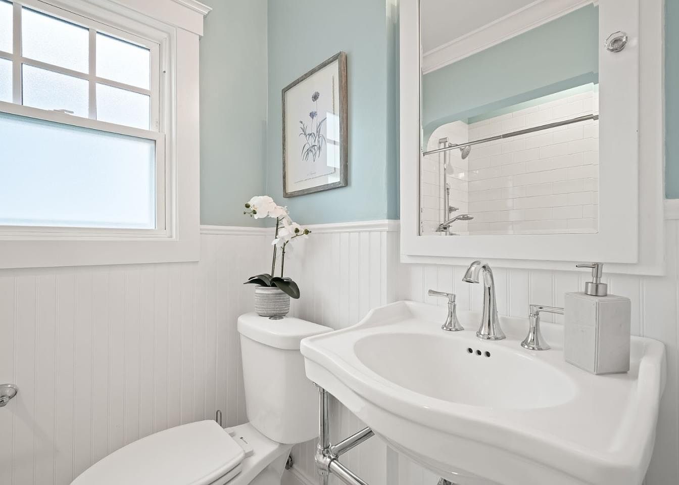 A compact bathroom featuring soft blue walls complemented by white wainscoting. A modern pedestal sink with a curved design sits beneath an elegant circular mirror. Sleek chrome faucet fixtures contribute to the sleek facade. A white toilet is positioned discreetly beside the sink, maintaining a clean aesthetic. A delicate orchid in a striped pot adds a touch of nature and sophistication. Natural light streams through a frosted window, enhancing the airy feel of the space. The overall design reflects a blend of modern functionality and classic charm, creating a serene and inviting atmosphere.
