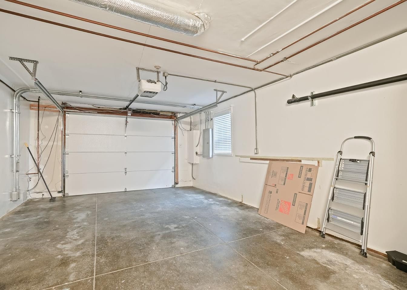 A spacious garage features a polished concrete floor that reflects soft light. The walls are painted white, creating a clean and bright atmosphere. A large, modern garage door dominates one side, with sleek metal tracks visible. Natural light filters through a small window, offering a glimpse of the outdoors. On the right, a foldable step ladder leans against the wall next to a shelf holding unpacked cardboard boxes. Exposed piping and electrical installations provide an industrial touch, contributing to the utilitarian vibe of the space. Overall, the garage maintains a minimalist aesthetic, emphasizing functionality.