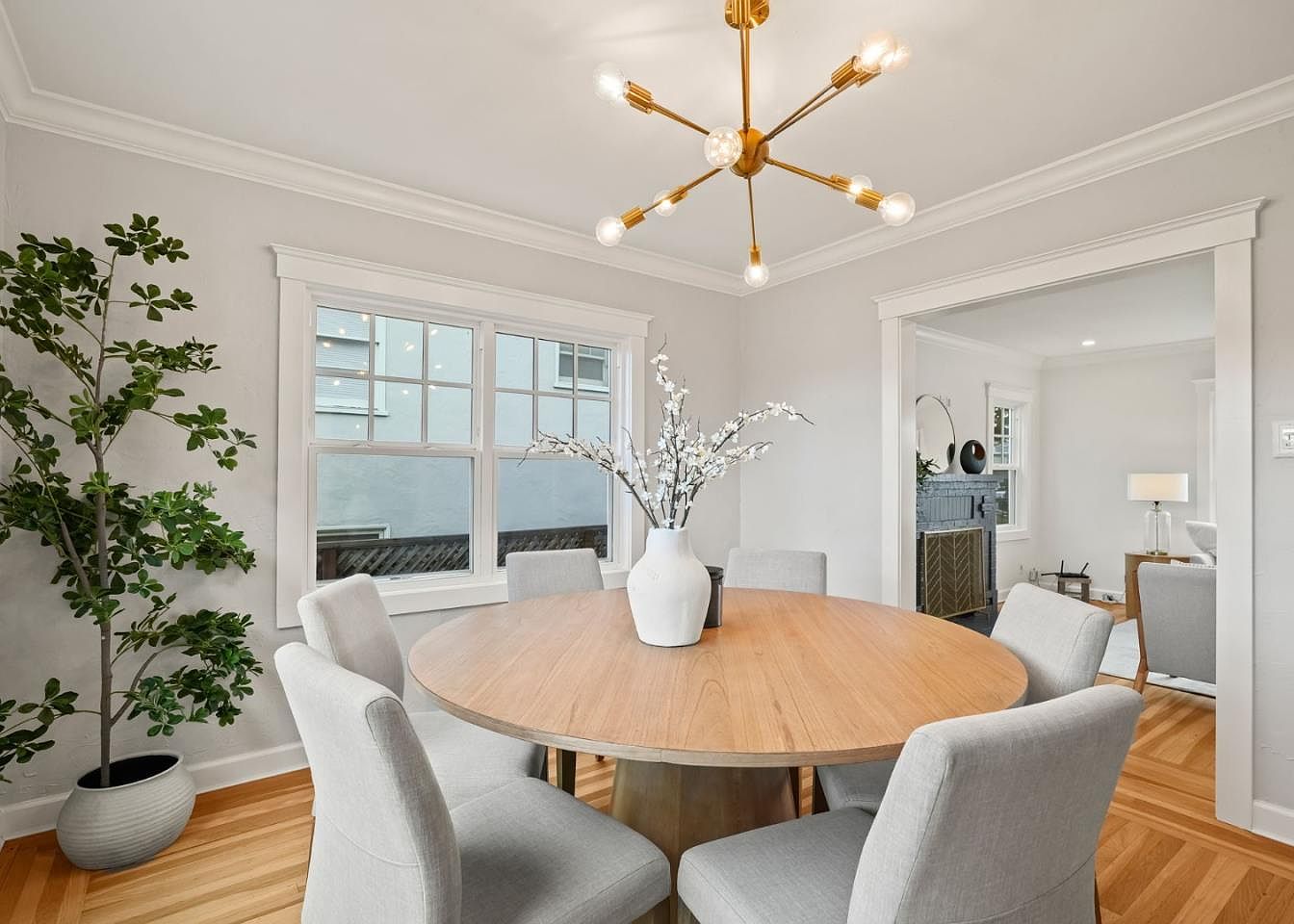 This dining area features a round wooden table surrounded by six light gray upholstered chairs, promoting an inviting atmosphere. Natural light floods the space through large white-framed windows, showcasing a clean, minimalist aesthetic with neutral gray walls. A slender potted plant adds a touch of greenery, enhancing the serene vibe. Centered on the table, a white vase holds delicate branches, serving as a subtle centerpiece. The lighting is provided by a stylish gold chandelier with spherical bulbs, adding a modern touch. Hardwood flooring in a warm tone complements the overall design, blending contemporary and classic elements seamlessly.