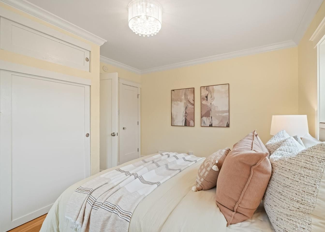 This cozy bedroom features soft yellow walls, creating a warm and inviting atmosphere. A queen-sized bed adorned with a light-colored comforter showcases layered pillows in shades of blush and cream. Framed abstract art hangs above the bed, adding a modern touch. To the side, a vintage-style white nightstand with a lamp provides soft illumination, complementing the delicate chandelier above. The room includes built-in white cabinetry for smart storage solutions, while the light wood flooring enhances the overall brightness. The space combines contemporary and classic elements, evoking comfort and tranquility.