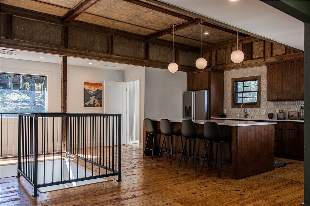 This image illustrates a spacious area featuring a blend of modern and rustic design elements. The warm, honey-toned hardwood floors contrast beautifully with the natural wood ceiling, showcasing exposed beams. A sleek, black railing frames a small landing, enhancing the open floor plan. To one side, a modern kitchen boasts dark cabinetry and stylish pendant lighting, while light walls make the space feel airy. Large windows allow ample natural light, creating an inviting atmosphere. Neutral finishes and subtle textures harmonize, highlighting the contemporary aesthetic while paying homage to traditional craftsmanship.