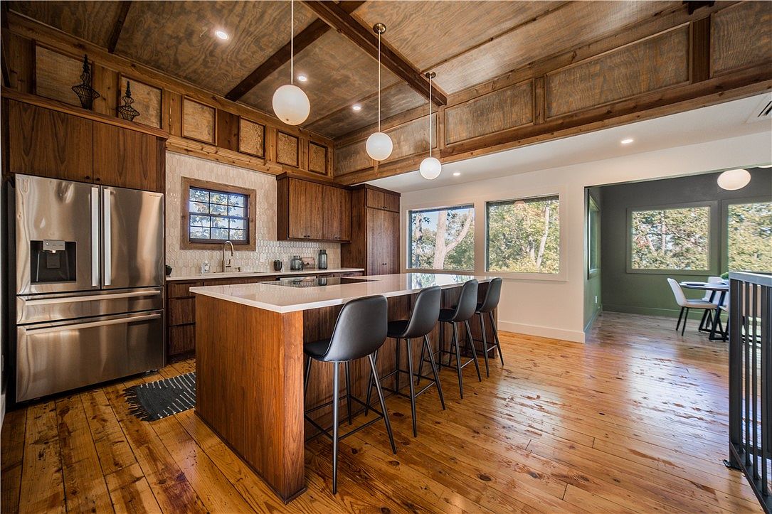 A contemporary kitchen featuring rich walnut cabinetry and a spacious island with a white countertop. Six sleek black barstools line the island, complemented by stylish pendant lighting above. The backsplash consists of geometric tiles that add texture, while a stainless steel refrigerator and appliances enhance the modern appeal. Natural light filters through large windows, showcasing the surrounding greenery, adding depth and warmth to the space. Rustic wood beams run across the ceiling, juxtaposing with the smooth, polished hardwood floor, creating a cozy yet sophisticated atmosphere. Nearby, a dining area with a green accent wall invites casual gatherings.