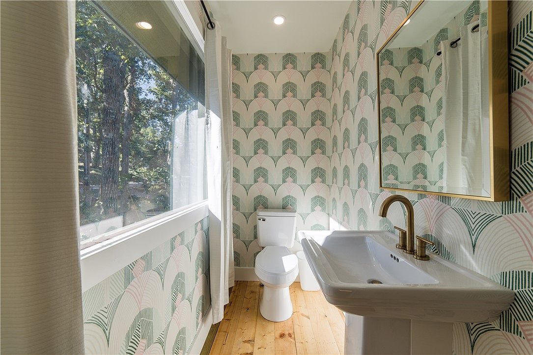 This bathroom features a bright, stylish design with a prominent window allowing natural light. The walls are adorned with a unique pastel pattern of overlapping arches in green and pink, adding a playful touch. A modern, white pedestal sink with a sleek gold faucet contrasts elegantly against the wallpaper. Adjacent, a minimalist white toilet complements the sink. Light-colored wooden flooring provides warmth and texture, enhancing the room’s inviting atmosphere. Sheer white curtains frame the window, while the gold-framed mirror above the sink adds a touch of sophistication. Overall, it combines a fresh, contemporary feel with pleasing aesthetics.