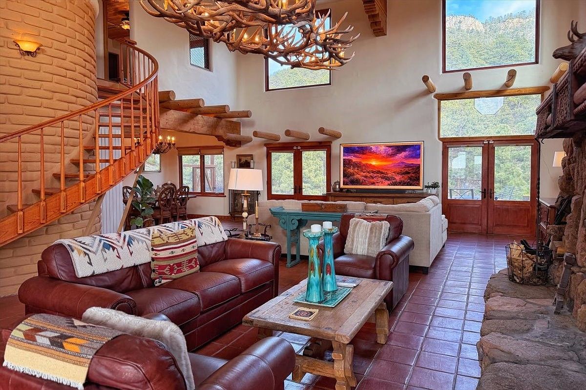 A spacious living room with a rustic charm features high ceilings and large windows that flood the space with natural light. The warm color scheme blends rich browns and earthy tones, highlighted by leather sofas adorned with patterned throw pillows. A wooden coffee table centers the area, topped with colorful decor elements. The stone fireplace adds warmth and character, while an antler chandelier hangs dramatically from the ceiling. To one side, a wooden staircase spirals upward, adorned with wrought iron details. The room is inviting, creating a cozy atmosphere that encourages gathering and relaxation.