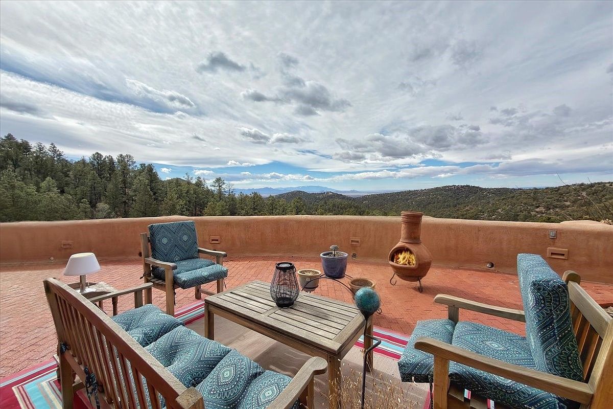 This outdoor roof deck features a cozy seating arrangement with two upholstered chairs adorned with blue patterned cushions, complementing the natural surroundings. A rustic wooden coffee table sits centrally, paired with a decorative lantern and potted plants, adding charm and warmth. The wall displays a soft earth-toned stucco finish that blends with the landscape. A unique clay chiminea, glowing with fire, offers warmth and ambiance. Grounded by a vibrant striped rug, the space invites relaxation while providing breathtaking views of the expansive hills and dramatic sky, enhancing the outdoor experience.