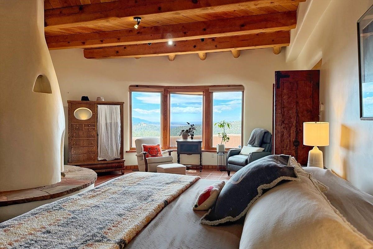 The bedroom features an inviting layout with rustic charm, highlighted by wooden beams on the ceiling. A cozy bed adorned with textured pillows is positioned prominently, inviting relaxation. Natural light floods through large bay windows, revealing stunning outdoor views. A vintage armoire stands against one wall, draped with white fabric, adding a soft touch. A neutral color palette of warm earthy tones enhances the calming ambiance. Nearby, a comfortable chair and ottoman create a reading nook beside a small table, providing an intimate space for quiet moments. The overall aesthetic combines comfort and nature’s beauty.