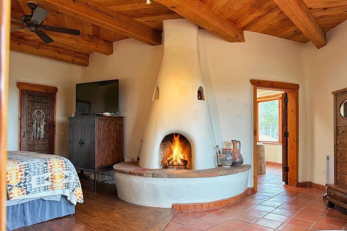 A cozy bedroom featuring a distinctive, sculptural fireplace made of white plaster. The fireplace has a rounded opening, showcasing a warm fire, and is set on a circular stone base. Rich wooden beams adorn the ceiling, enhancing the rustic charm. The floor is covered in warm terracotta tiles, complementing the fireplace’s earthy tones. A modern flat-screen TV is mounted on the wall above a dark wooden armoire, which incorporates intricate detailing. A patterned throw drapes over the bed, adding a splash of color, while a traditional wooden door with a decorative element leads to an adjoining space.
