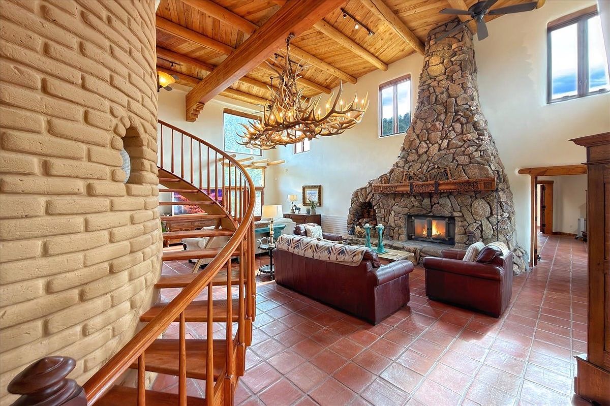 This expansive living room features a charming blend of rustic and modern aesthetics. A sweeping spiral staircase with warm wooden railings leads to the upper levels, complementing the textured clay walls. The focal point is a majestic stone fireplace, accented by carved wood detailing, which brings warmth and character. Large windows allow natural light to flood the space, enhancing the earthy tones of the terracotta tile floor. Leather furnishings provide comfort and sophistication, while an imposing antler chandelier adds a unique touch. Layers of textiles and the open layout create an inviting atmosphere for relaxation and gathering.