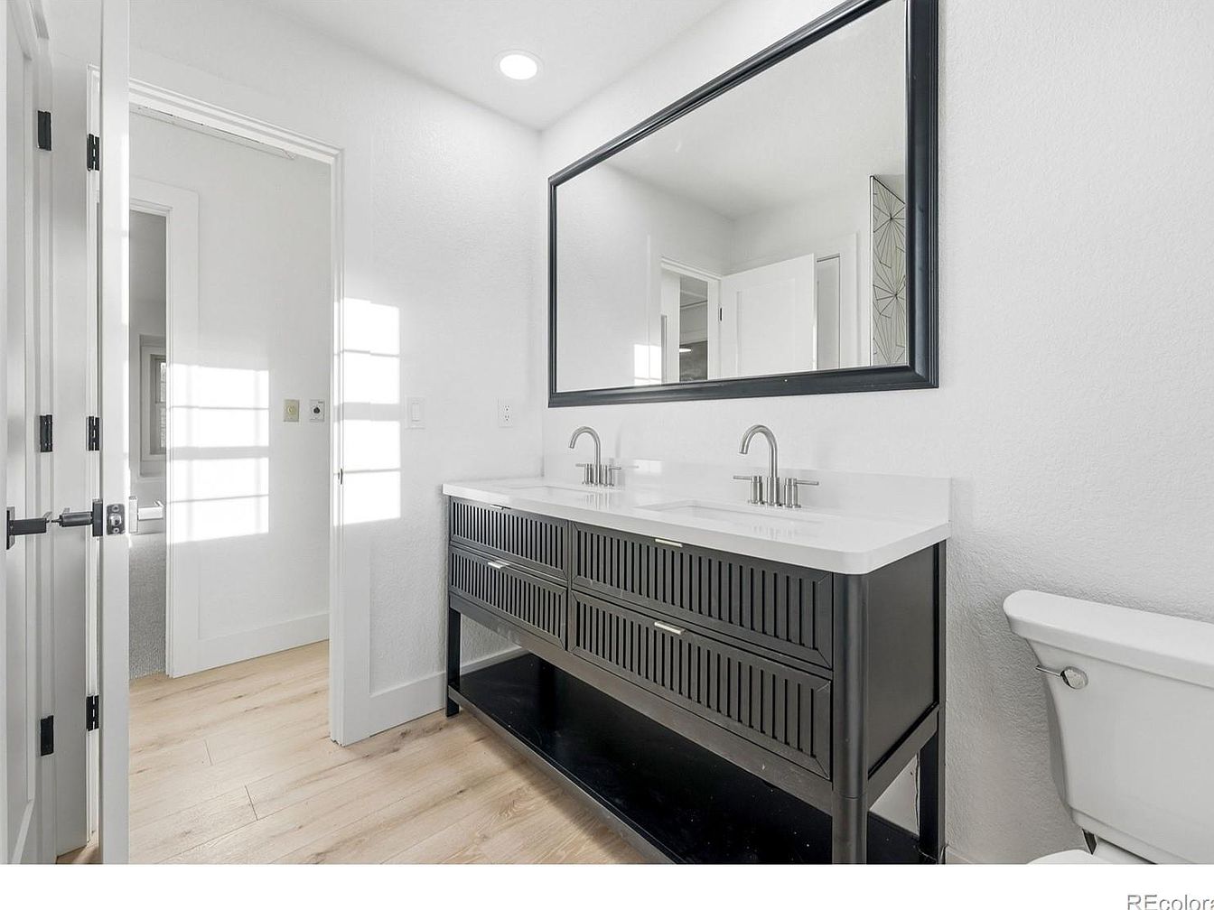 This bathroom features a sleek, modern design with a clean layout. The walls are painted in a soft white, enhancing the bright atmosphere. A large mirror framed in black dominates above a stylish vanity, which showcases a smooth white countertop paired with a black, slatted-front base, offering a contemporary contrast. Minimalistic décor elements like a vase with greenery and framed artwork add subtle color. Textured baskets beneath the vanity provide storage while complementing the overall aesthetic. Natural light floods through the entryway, creating a welcoming ambiance. Light wood flooring completes the space, unifying the design.