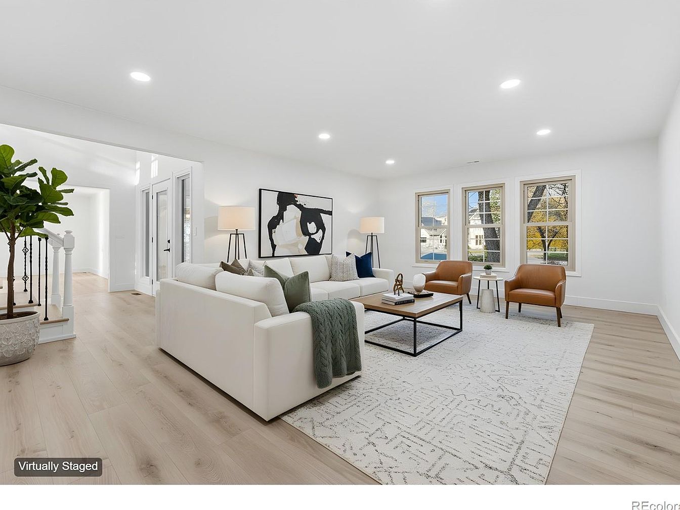 This spacious living room features a minimalist design with a bright, airy atmosphere. The walls are painted in a crisp white, enhancing the natural light flowing in from three large, multi-pane windows. These windows offer a view of the outdoors and frame the vibrant scenery. A sleek, light wood floor runs throughout, providing a warm contrast to the walls. The architecture includes a contemporary staircase with a white balustrade and black wrought iron spindles, adding a touch of elegance. Recessed lighting in the ceiling illuminates the space, highlighting the openness and inviting feel of this serene area.