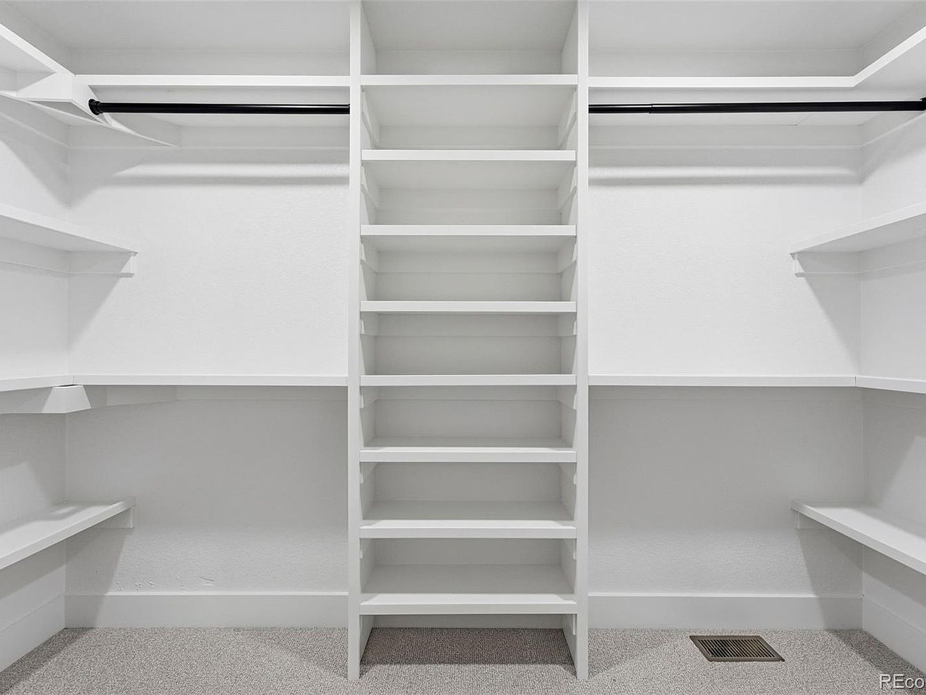 This spacious walk-in closet showcases a minimalist design with a bright, all-white color scheme. The walls and shelving are crisp white, enhancing the room’s airy feel. Storage options include open shelves on either side for quick access to folded clothing and accessories. A central clothing rod in black adds a sleek touch, contrasted against the white backdrop. The floor features soft, neutral carpeting, providing comfort. The layout is practical, with ample room for organization and movement, making it an ideal space to showcase footwear or hang garments. Overall, it embodies a modern aesthetic focusing on efficiency and simplicity.