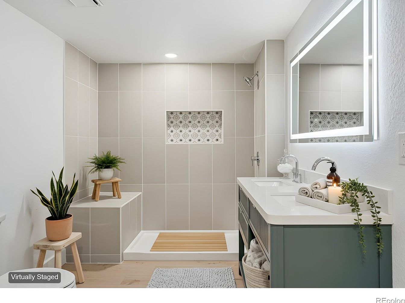 The bathroom features a sleek, modern design with a neutral color palette. Square and rectangular tiles in soft beige line the walls, creating a clean backdrop complemented by a stylish inset shelf displaying intricate patterned tile. A double vanity with a light countertop contrasts against a soothing teal cabinetry, offering ample storage and an elegant touch. Above, a bright, illuminated mirror enhances the spacious feel, while a delicate plant provides a refreshing organic element. The shower area, equipped with a wooden mat, adds a naturalism, and a small potted plant on a wooden stool introduces warmth to the contemporary space.