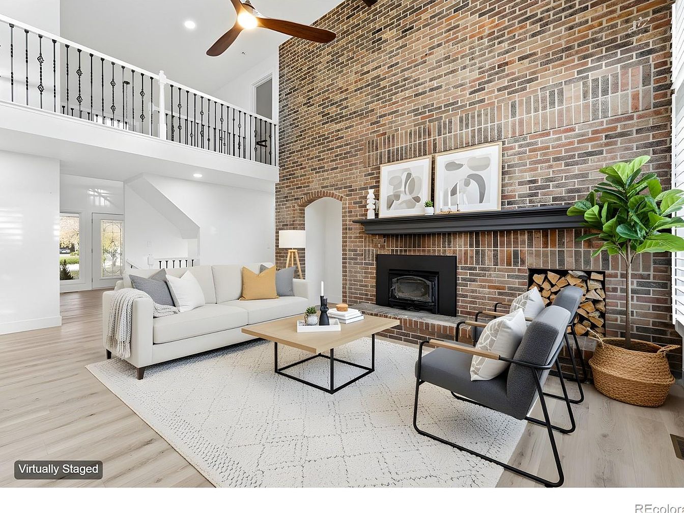 This spacious living room features a striking exposed brick wall, creating a warm and rustic backdrop. A sleek black fireplace sits centrally beneath a wide mantle, complemented by stacked firewood neatly arranged beside it. The open layout is illuminated by ample natural light from the adjacent large windows and vaulted ceilings that create an airy atmosphere. The flooring is light-colored laminate, enhancing the room’s brightness and offering a modern touch. A simple black and white staircase leads to a balcony above, adding architectural interest while maintaining the home’s open feel. Decorative iron railings provide elegance and safety.