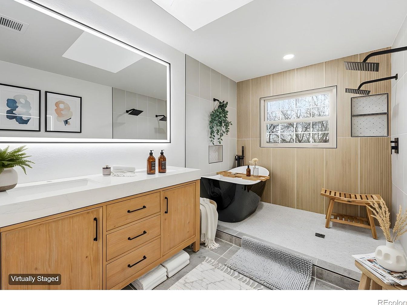 A modern bathroom combines sleek design and natural elements. Warm wooden cabinetry with matte black hardware contrasts beautifully with a light stone countertop. Above, a large backlit mirror enhances the spacious feel. Two framed abstract art pieces add a touch of elegance. The shower features dual rain shower heads and a subtle glass partition. A freestanding black tub, accented with a wooden tray, serves as a focal point. Light wood panels provide warmth against the white tiles. A wooden bench and decorative plants contribute to a tranquil atmosphere, promoting relaxation in this stylish sanctuary.