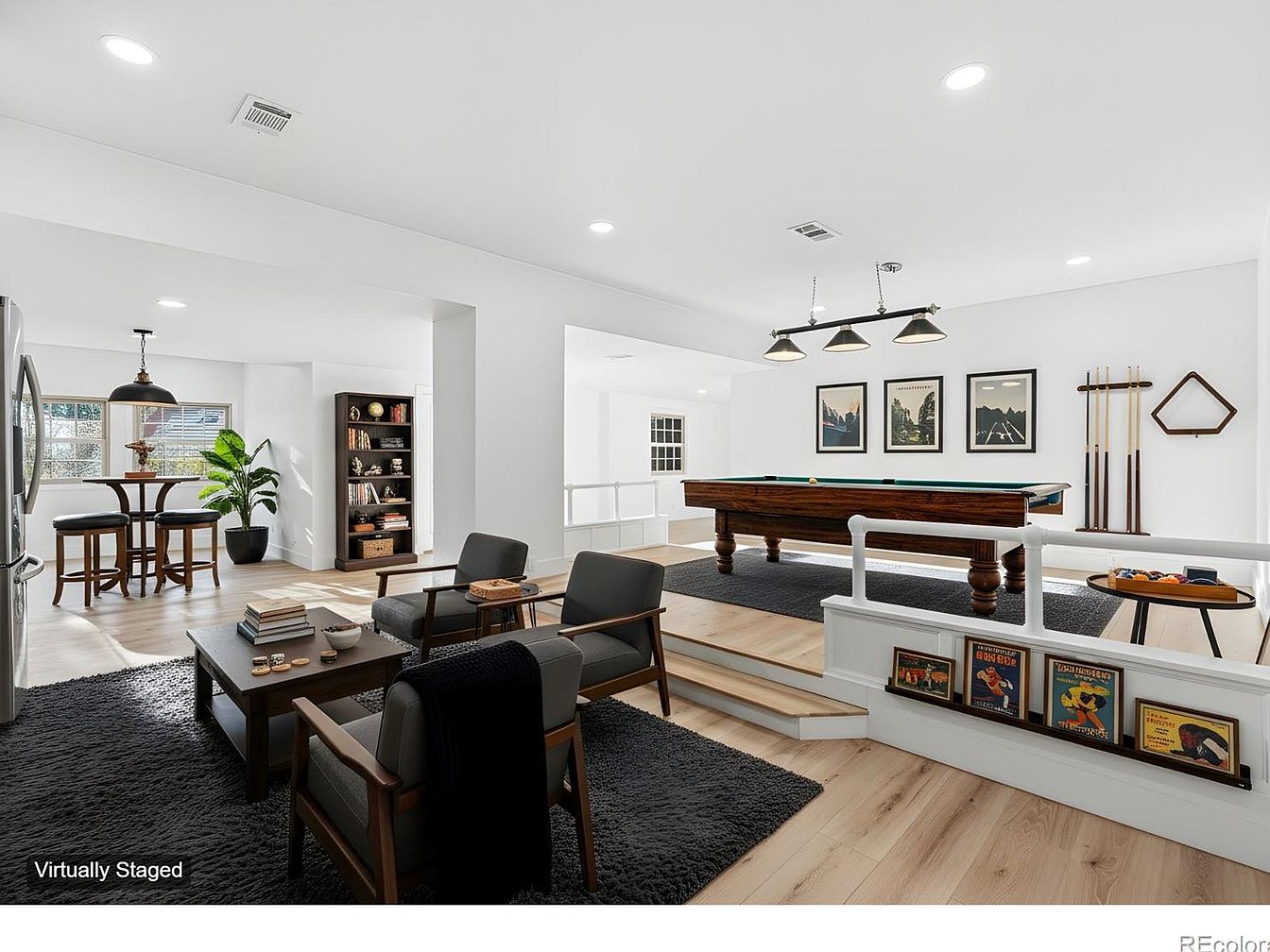 This game room features a spacious layout with a blend of relaxation and entertainment. A rich wooden pool table takes center stage, complemented by a sleek trio of pendant lights above. The walls are adorned with framed artwork, adding a personal touch. A plush dark rug provides warmth beneath a set of modern armchairs, perfect for socializing. A small side table holds decorative items, ensuring a cozy atmosphere. In the background, a dining nook with tall stools invites casual gatherings. Architectural details include smooth white walls and warm wooden flooring, enhancing the inviting ambiance.