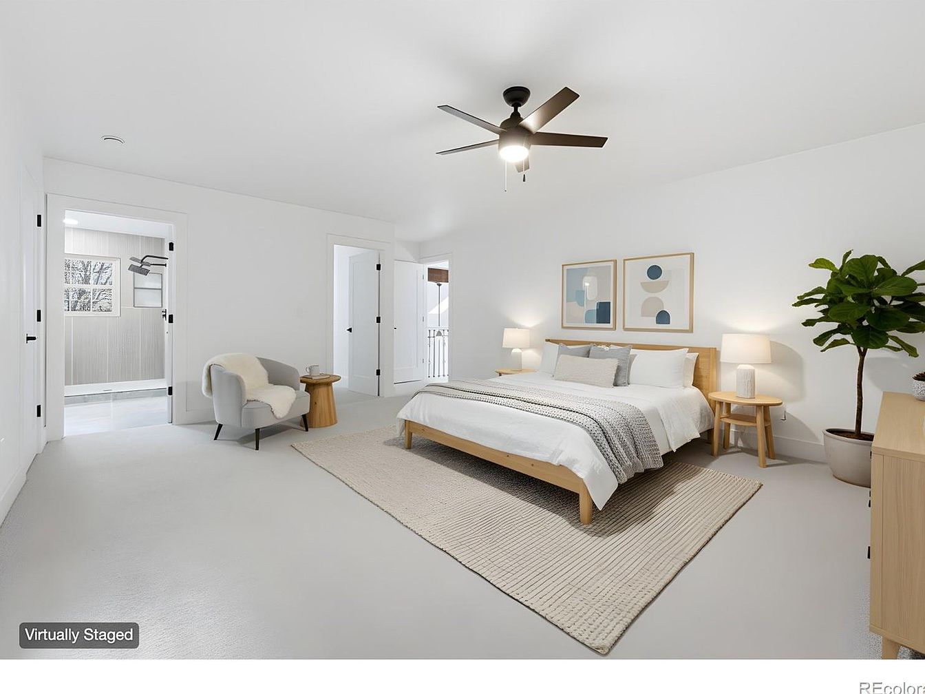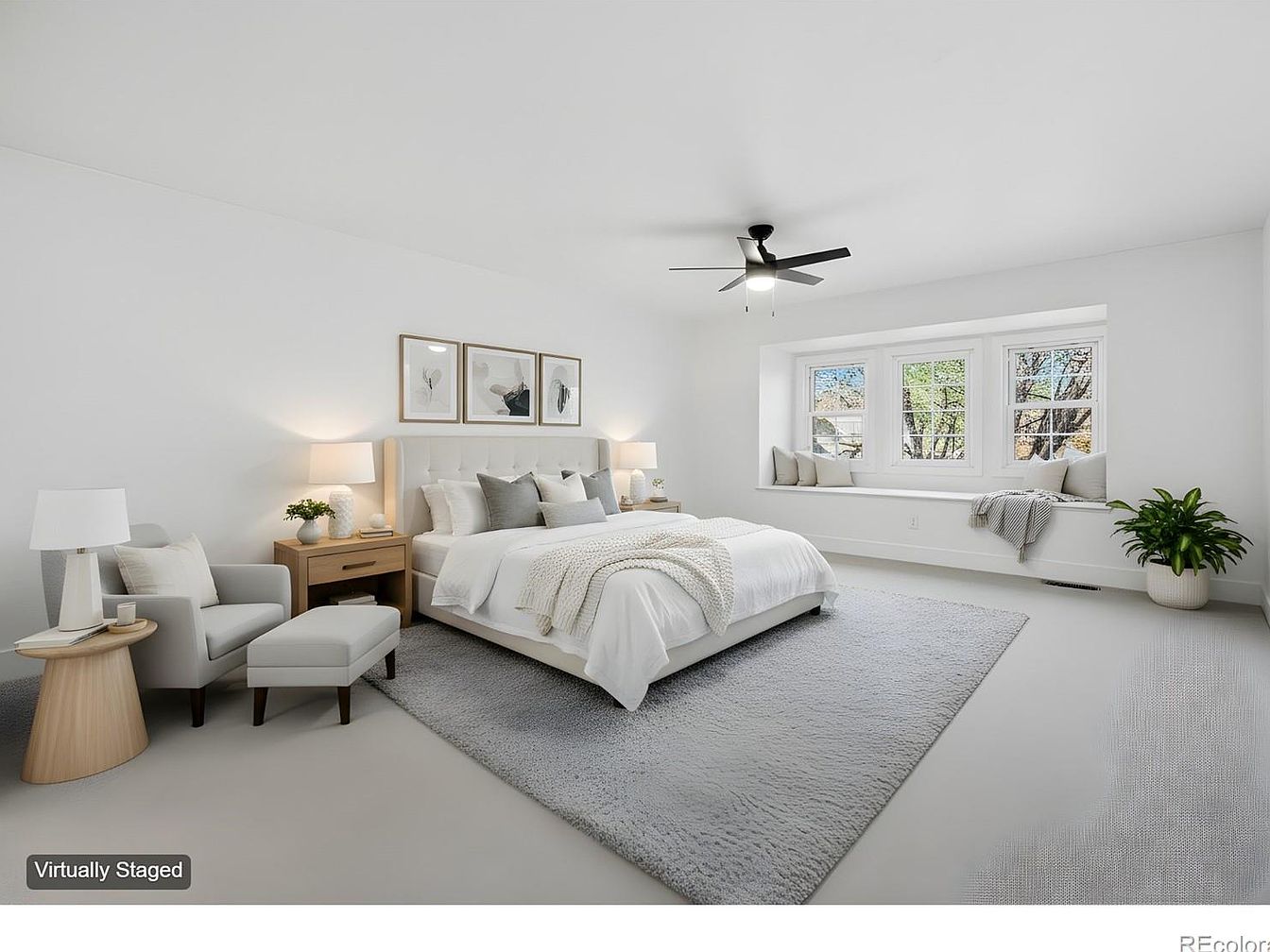 This serene bedroom exudes modern elegance with a palette of soft whites and neutral tones. A plush, white bed dominates the space, accented by gray and textured pillows. Beside the bed, natural wood nightstands support stylish lamps, adding warmth. A cozy armchair invites relaxation, paired with a lightweight ottoman. The light gray area rug underfoot enhances comfort while a subtle ceiling fan adds a touch of functionality. Expansive windows provide ample natural light, illuminating the room and showcasing a window seat adorned with soft cushions and a patterned throw, complemented by a potted plant, merging comfort with nature.