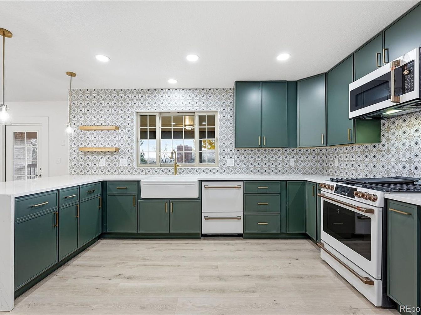This contemporary kitchen features a U-shaped layout with deep green cabinetry enhanced by sleek gold handles. A white farmhouse sink sits beneath a window, providing natural light and a view. The backsplash showcases a geometric tile pattern, adding visual interest with its light and dark contrasts. Quartz countertops in a bright white tone complement the cabinets and reflect soft, ambient lighting from pendant fixtures above. A stylish gas range is seamlessly integrated, while open shelves display decorative items. Light-colored hardwood flooring ties the design together, creating an inviting atmosphere perfect for cooking and entertaining.
