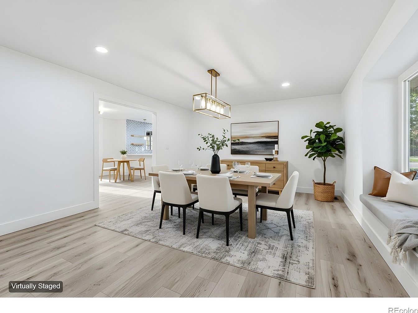 This dining area showcases a modern design, featuring a light wood dining table surrounded by sleek, white chairs on a textured area rug. The neutral color palette of soft beige, white, and light gray creates an inviting ambiance. Overhead, a stylish gold and glass pendant light adds elegance, complementing the artwork on the wall, which features earthy tones. A tall, leafy plant in a woven basket introduces a touch of nature. The open layout connects seamlessly with another space in the background, enhancing the overall spacious feel. Wide-plank flooring adds warmth to the contemporary aesthetic.