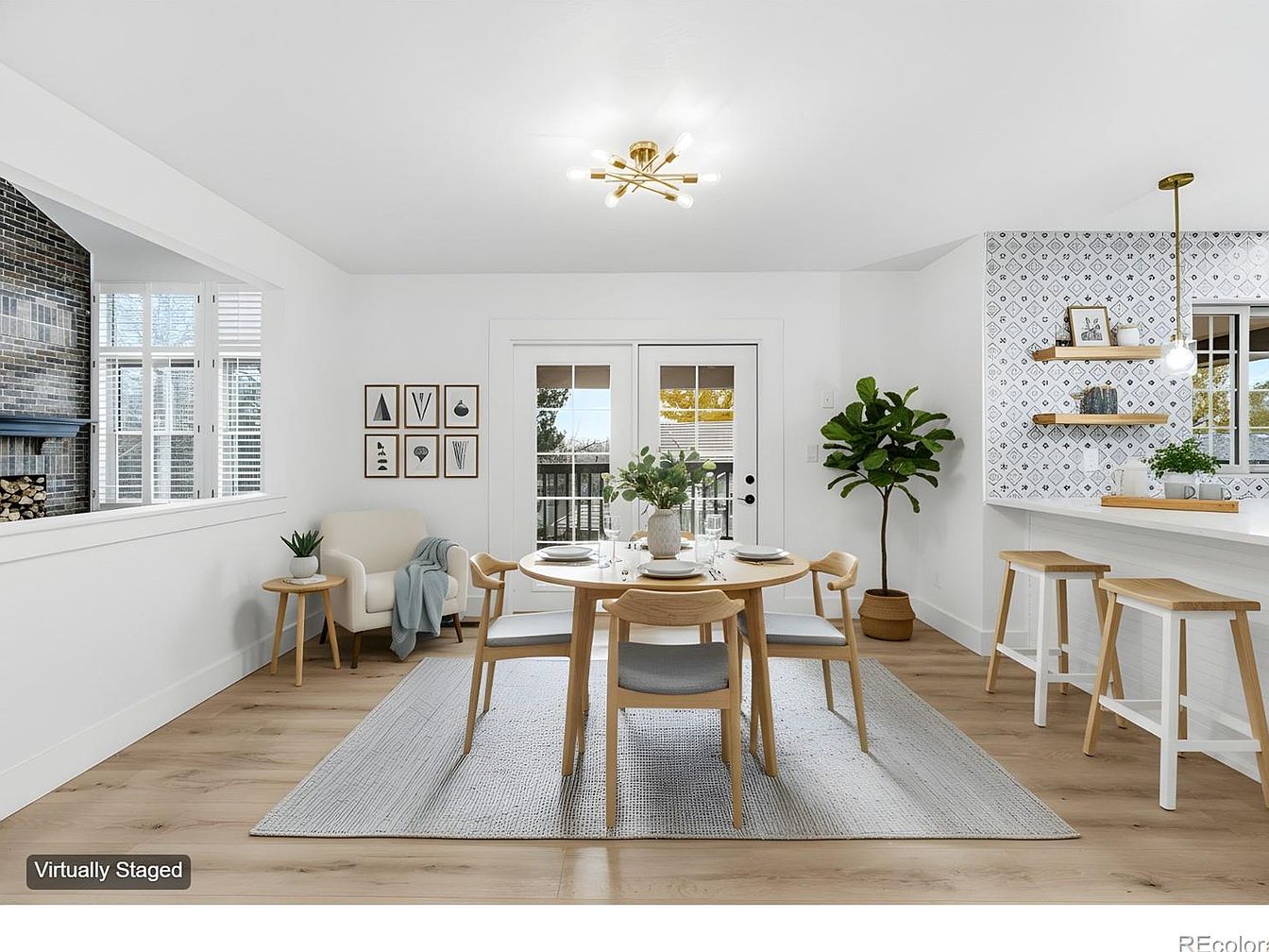 This dining area features a light and airy design with a white color scheme dominating the space. A round wooden table is surrounded by four sleek chairs, highlighting a modern aesthetic. A textured gray area rug anchors the seating arrangement, while a charming potted plant adds a touch of greenery. The backdrop showcases a stylish accent wall with a geometric pattern, complementing the light-colored cabinetry and open shelving. Natural light floods in through large windows and double doors that lead to an outdoor deck, enhancing the warm, inviting atmosphere. Elegant pendant lighting offers a subtle glow above the table.