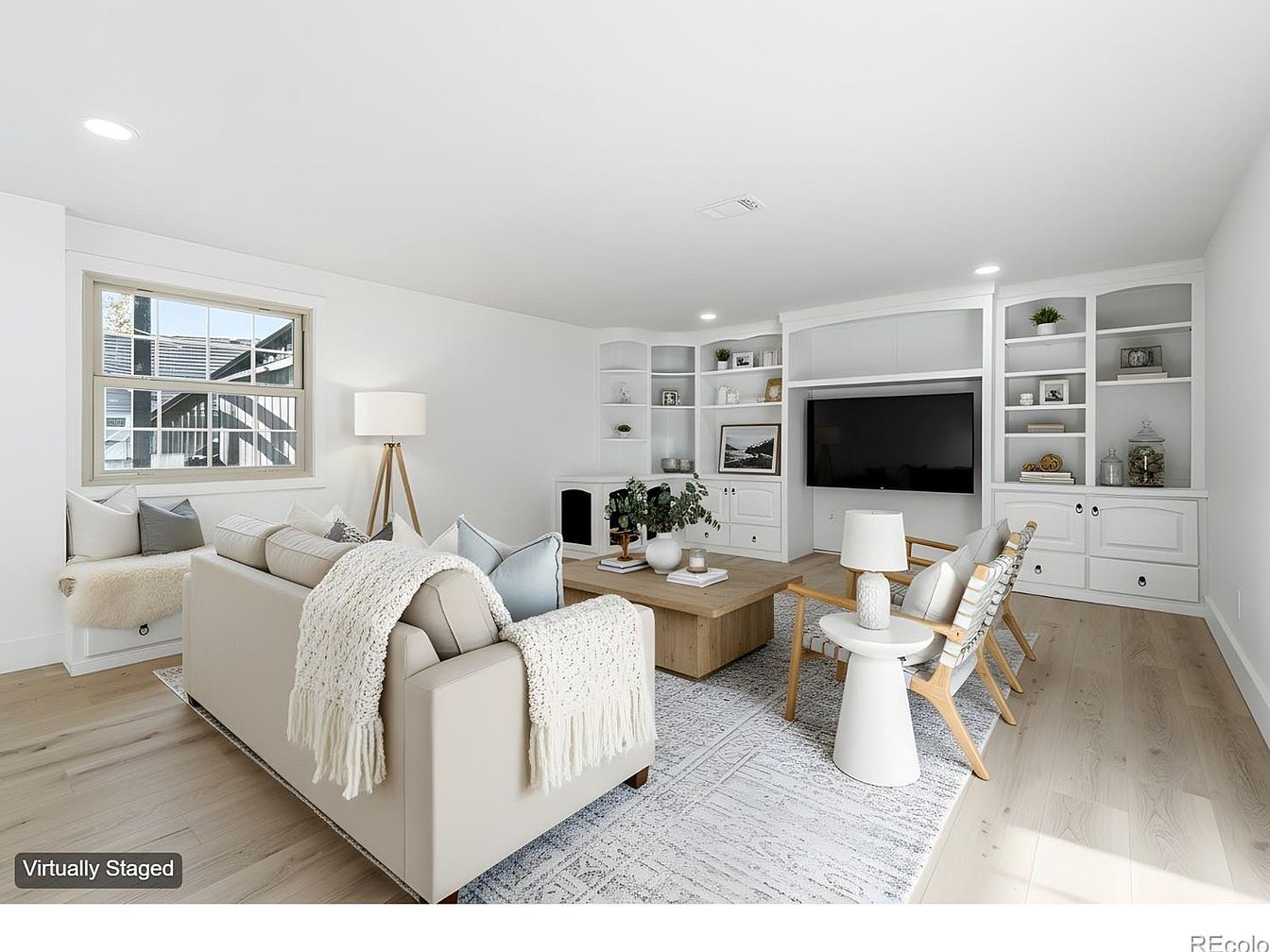 A spacious living room features a large sectional sofa dressed in soft beige fabric, accented by a chunky knit throw. Natural light floods the room through a sizable window adorned with light-colored trim. To the left, a sleek floor lamp stands next to a window seat, adorned with plush cushions in subtle pastels. A wooden coffee table with a textured surface sits center stage, surrounded by modern, white accent chairs. Built-in shelving flanks a wall-mounted television, showcasing decorative items and books. The light wood flooring, paired with a soft area rug, creates a warm, inviting atmosphere.