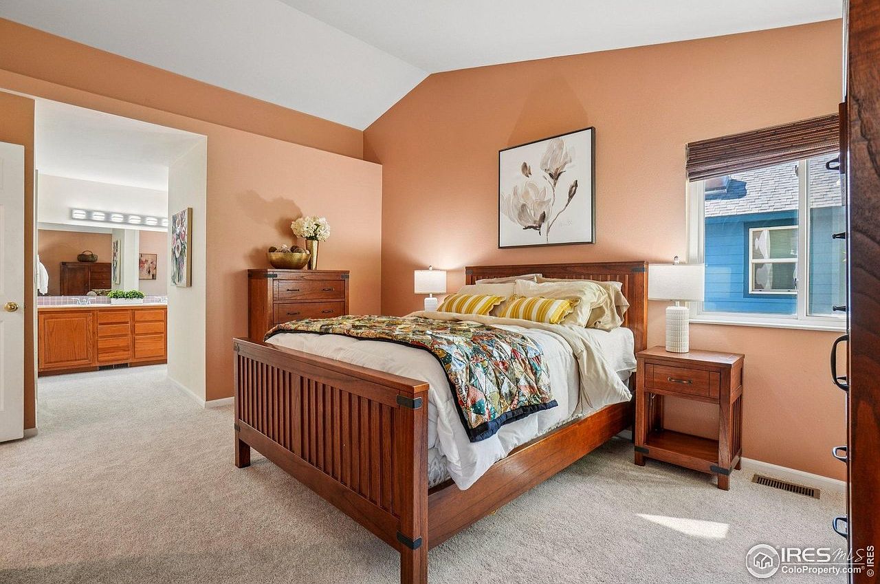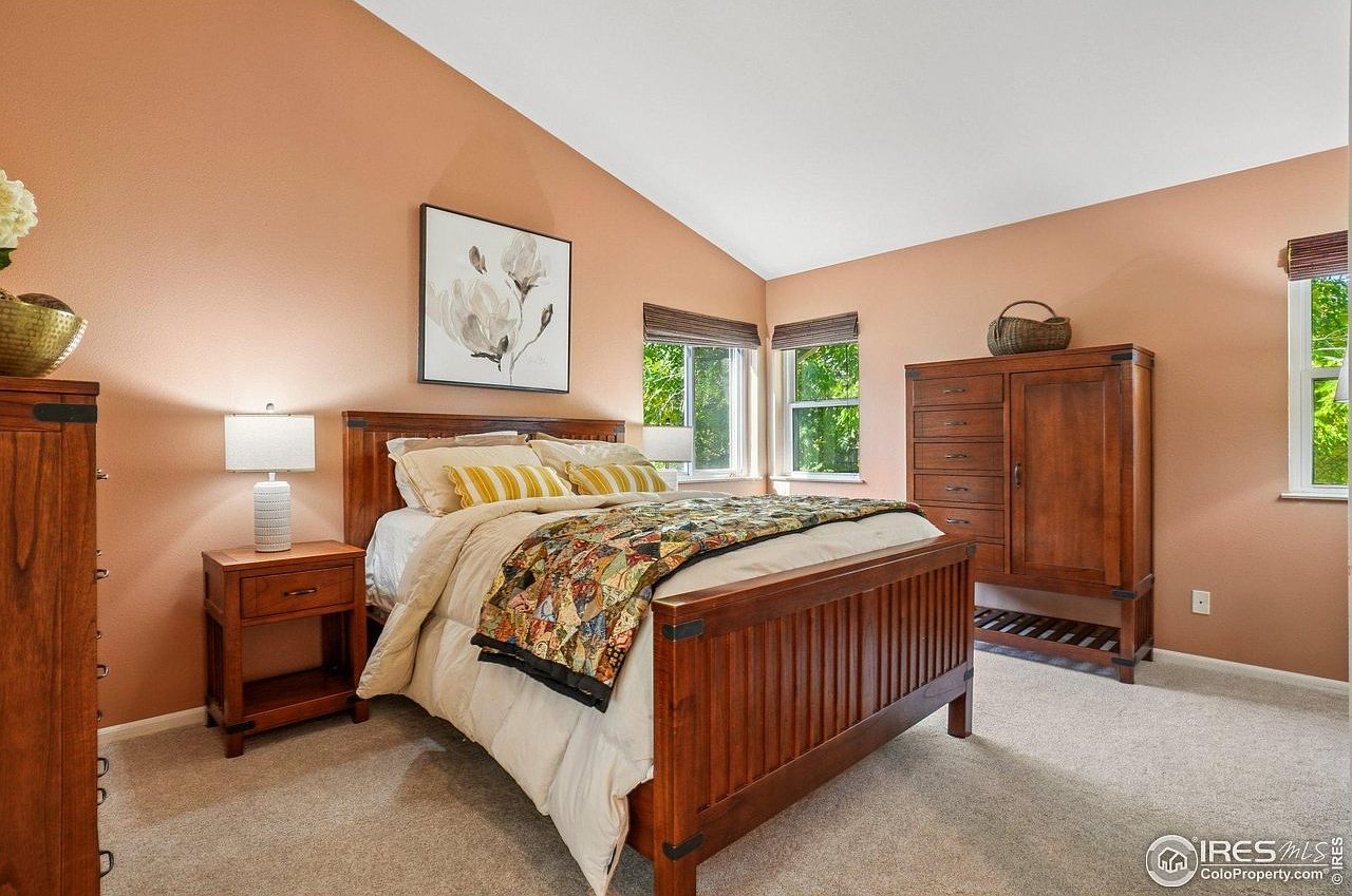 The bedroom features warm peach walls and a vaulted ceiling, enhancing the spacious feel. A large wooden bed, styled with a cozy comforter and vibrant patchwork quilt, anchors the room. Flanking the bed, two sleek nightstands hold lamps, providing soft lighting. Opposite, a tall wooden dresser complements the bed’s design, while two windows framed with blinds let in natural light, creating a serene atmosphere. Decorative art hangs over the bed, adding a touch of elegance. Plush carpeting underfoot contributes to the comfort, inviting relaxation and a peaceful retreat within this intimate space.