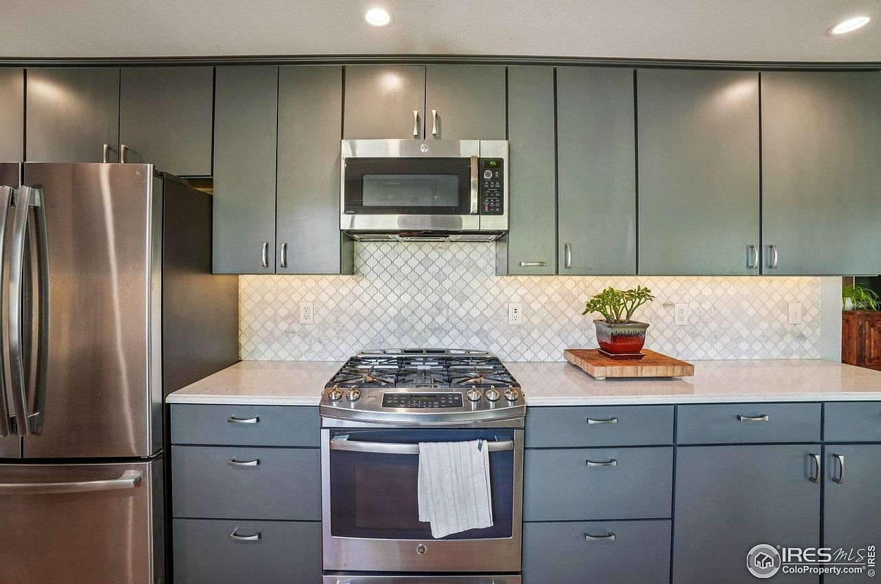 A modern kitchen showcasing a harmonious blend of functionality and style. The cabinetry features sleek, dark gray doors paired with polished silver handles, conveying a contemporary aesthetic. A stainless-steel refrigerator stands prominently next to a gas range, crowned by a microwave. The light-colored countertops provide a crisp contrast, complementing the intricate white and gray tile backsplash that adds texture and depth. A wooden cutting board rests beside a vibrant potted plant, infusing life into the space. Ample task lighting illuminates the area, enhancing the kitchen’s bright and inviting atmosphere, perfect for culinary creativity.