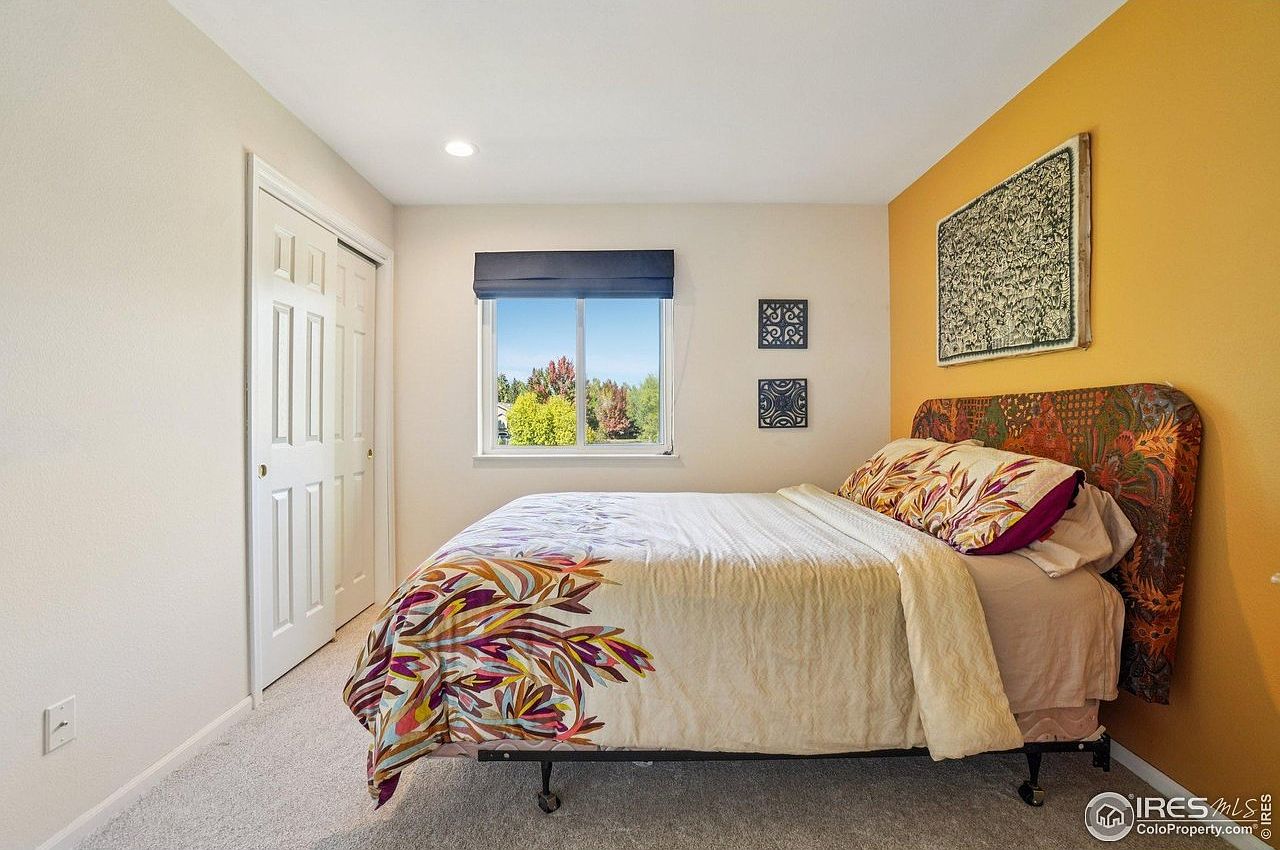 A cozy bedroom featuring a warm palette, highlighted by an accent wall in a rich mustard yellow. The bed is adorned with a colorful floral comforter and layered pillows, creating an inviting look. A stylish upholstered headboard with intricate patterns adds character. Natural light spills through a window dressed with a navy blue roller shade, offering views of vibrant trees outside. Opposite the bed, white double doors lead to a closet, while minimalist wall art complements the decor. The soft beige carpet adds warmth underfoot, enhancing the space’s comfort and tranquility.