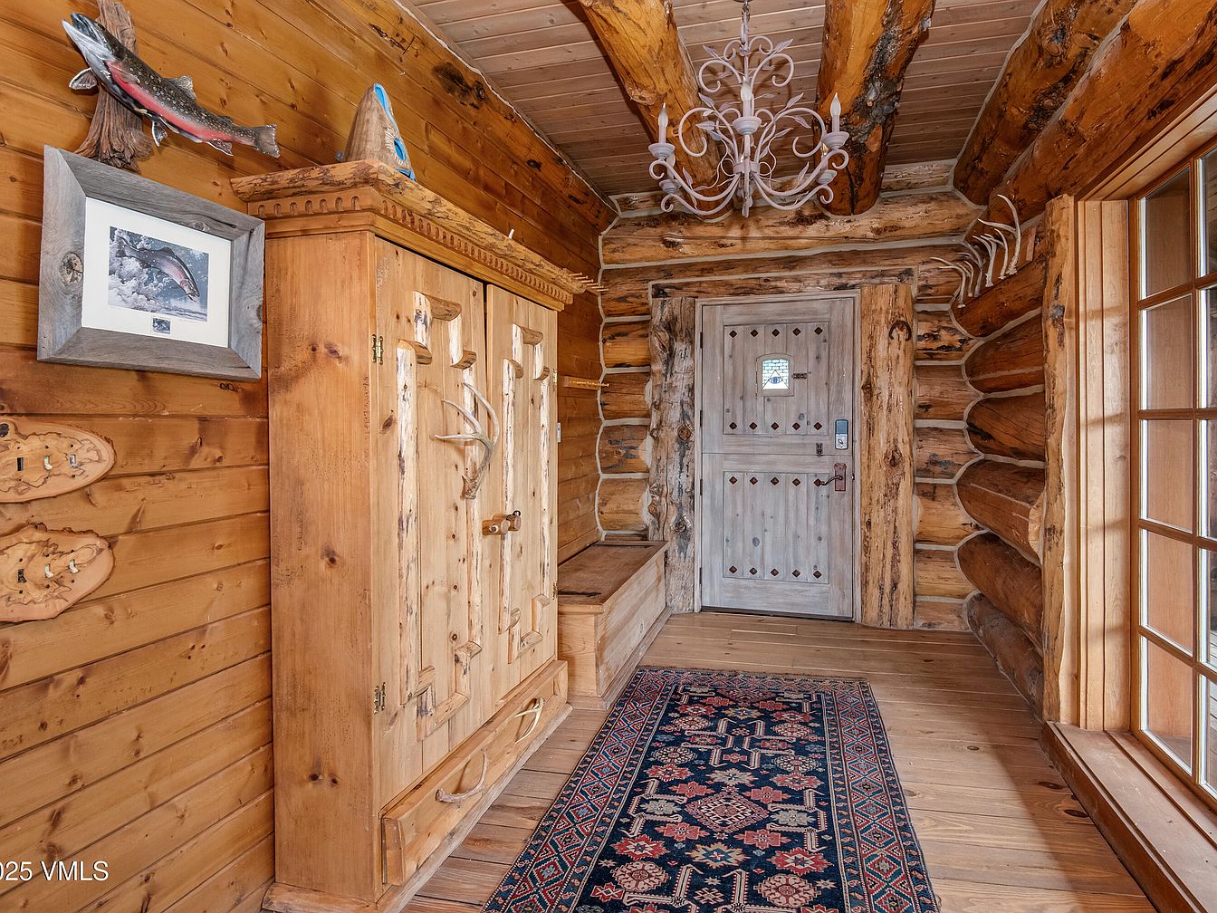 This entryway features rustic log cabin architecture, with warm wooden walls and exposed beams enhancing the cozy atmosphere. A detailed wooden cabinet stands to the left, crafted from natural wood, and adorned with unique handles that add character. The entrance door displays intricate woodwork, including diamond accents. Multiple hooks for coats and accessories accentuate functionality. A charming chandelier hangs from the ceiling, providing soft illumination. The floor is covered with an elegant area rug, harmonizing deep reds and blues, while a framed fishing-related artwork complements the theme, contributing to a welcoming, nature-inspired space.