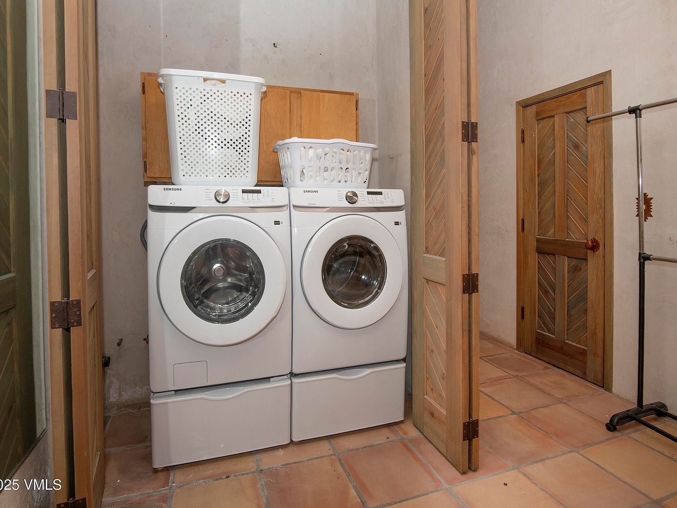A functional laundry room showcases two matching white front-loading washers and dryers, neatly positioned against a textured light-colored wall. Above them, wooden shelves hold two laundry baskets, one featuring an airy design. The room retains a rustic charm with terracotta tile flooring, providing warmth and an earthy tone. To the right, a small, elegantly crafted wooden door with a chevron pattern adds character, while additional storage is evident through sliding wood panels. The overall ambiance combines practicality with subtle stylish elements, facilitating an efficient yet aesthetically pleasing laundry space.